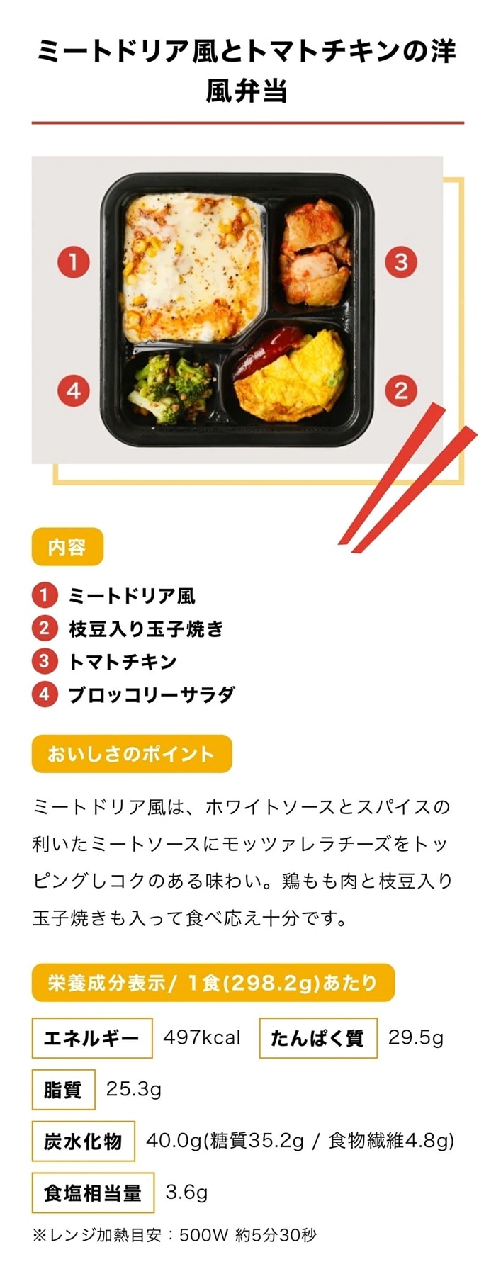 | 商品内容 | ●ミートドリア風とトマトチキンの洋風弁当 1食 |