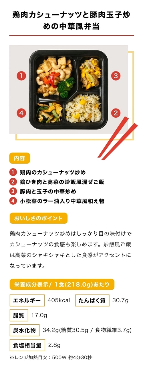 | 商品内容 | ●鶏肉カシューナッツと豚肉玉子炒めの中華風弁当 1食 |