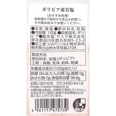 ボリビアの山々から採掘される薄い桃色のさらっとした岩塩です。