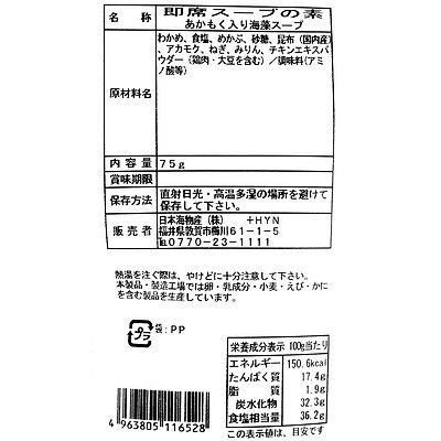アカモクとがごめ昆布の入った粘りある海藻スープ。スプーン大さじ1杯を入れお湯を注ぐだけで美味しいスープができます。