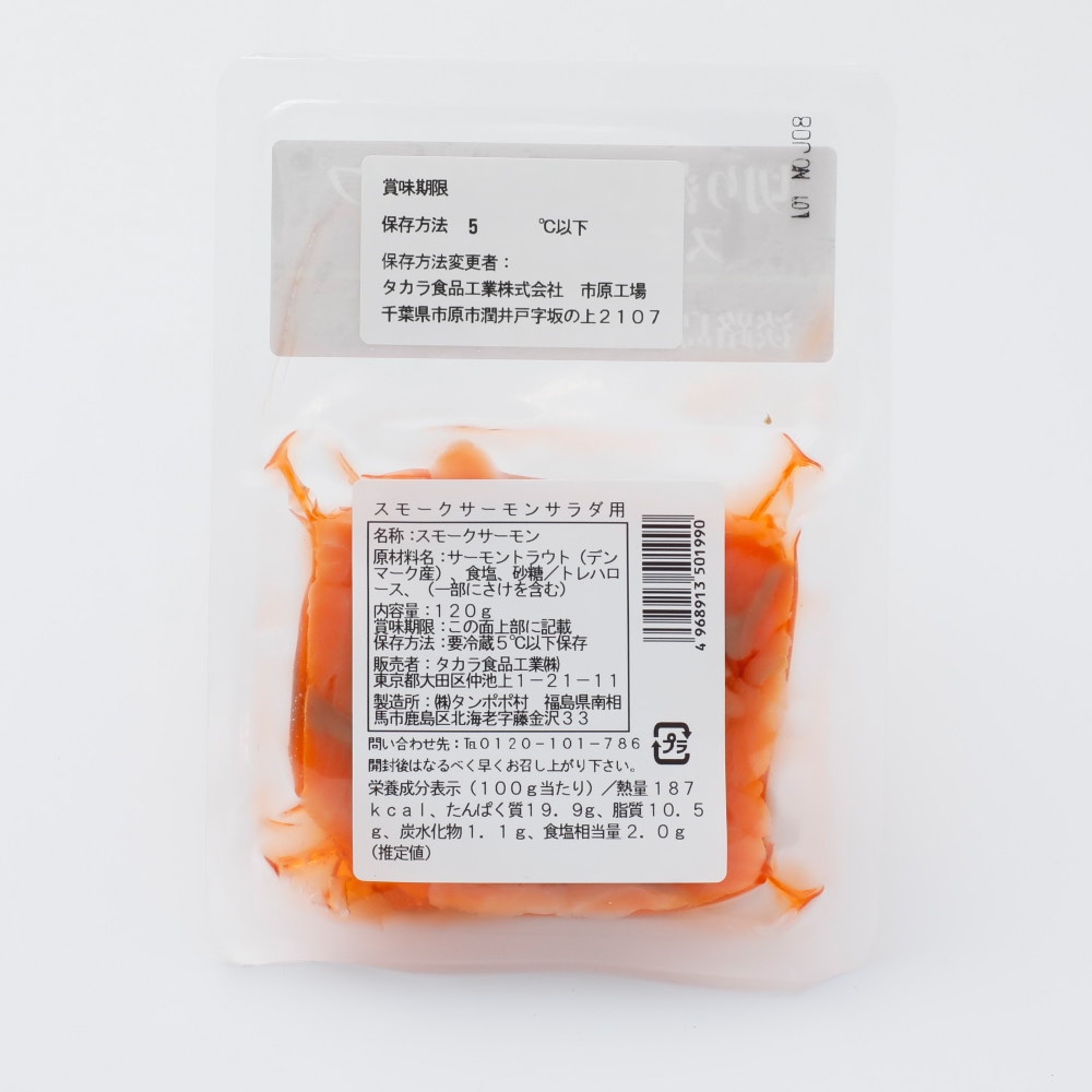 デンマーク産のサーモントラウトを、淡路島の藻塩で味付けし、桜のチップでスモークしました。使い勝手の良い切り落しタイプ。