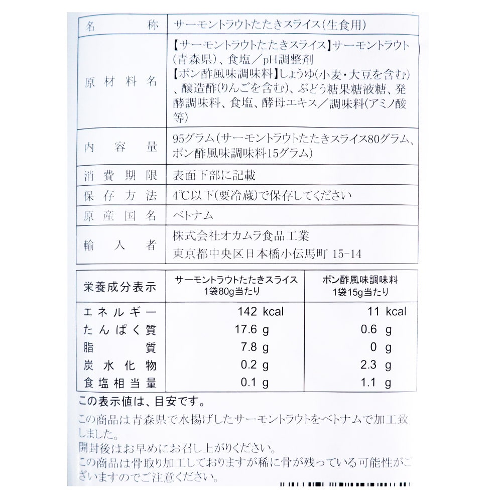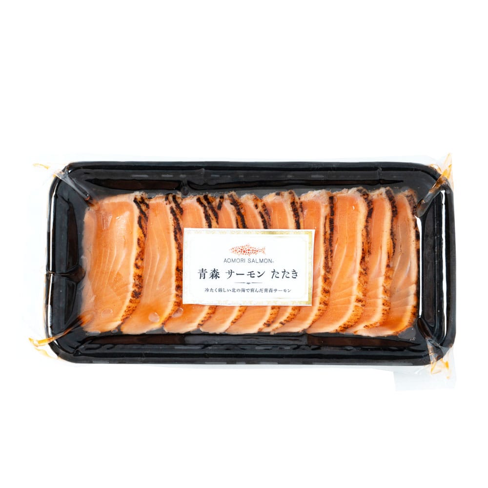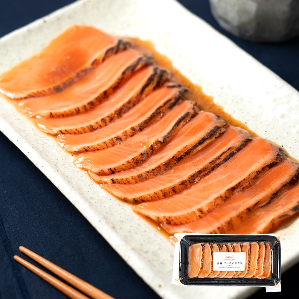 冷たく厳しい青森県の海にて養殖された青森サーモンを使用した”サーモントラウトたたき”です。タレ付き
