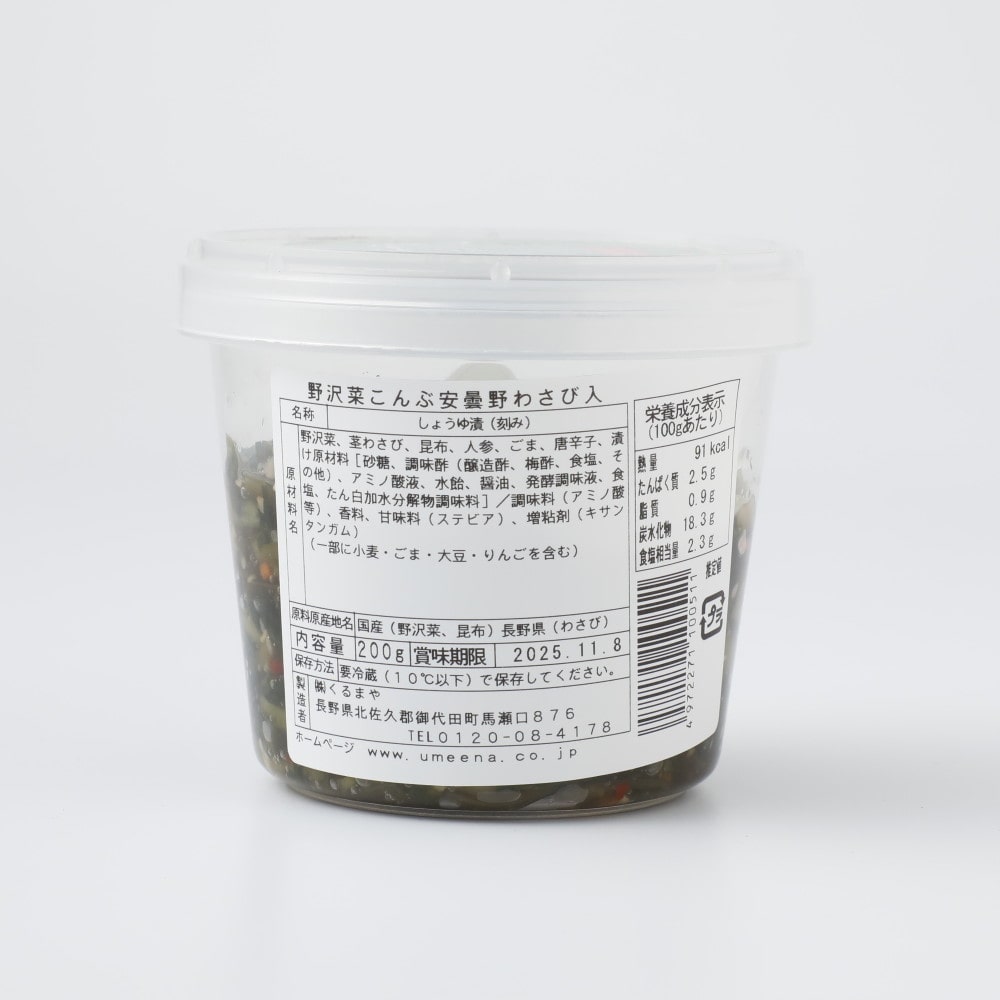 野沢菜こんぶに信州安曇野産のわさびを加えました。ピリッとした味と香りが美味しさを引き立てます。