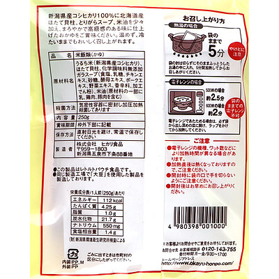 新潟コシヒカリ100%の5分づき精米を、鶏がらスープ焼き塩などで味付けして、ホタテを加えたまろやかな味のお粥。