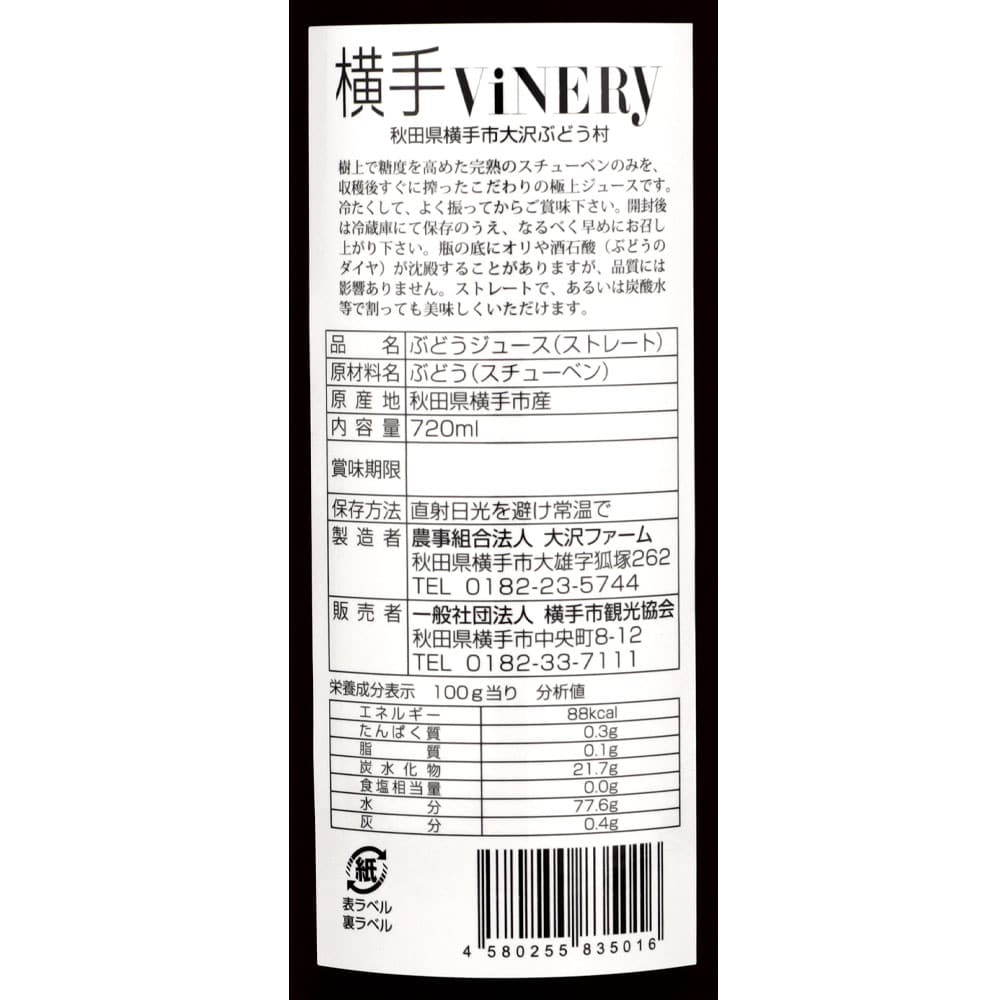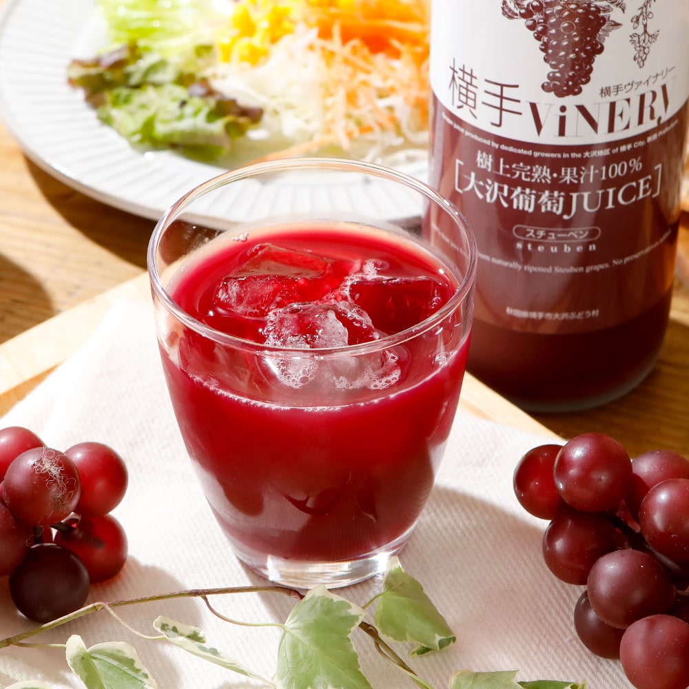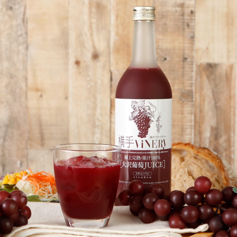大沢ぶどう村の契約農家が、糖度約23度になるまで樹上で完熟させたステューベン種のみを贅沢に搾りました。