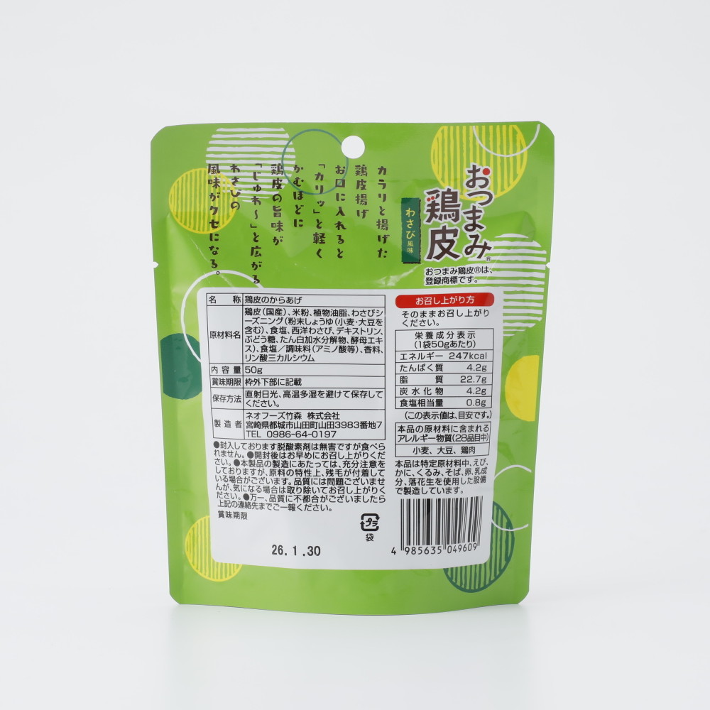 - > ネオフーズ竹森 おつまみ鶏皮 わさび風味 50g