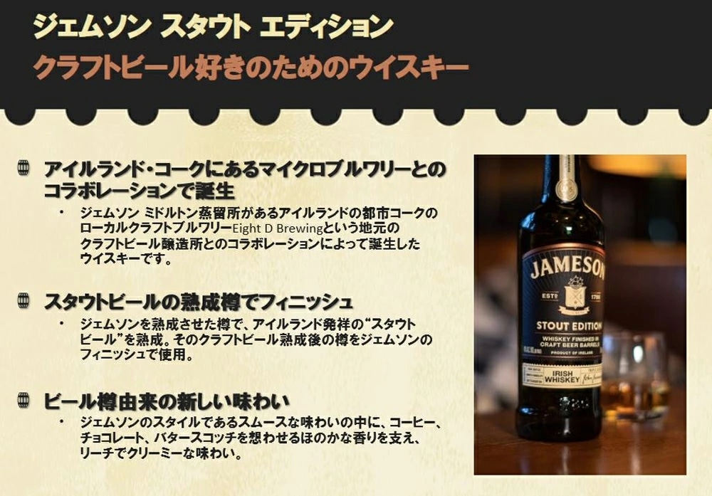 「ジェムソン スタウト エディション」は、Eight D Brewingという地元のクラフトビール醸造所とのコラボレーションによって誕生したウイスキーです。ジェムソンウイスキーを熟成させた樽でアイリッシュスタウトビールを熟成させ、そのビール熟成の樽をジェムソンのフィニッシュで使用。その結果ジェムソンのスタイルであるスムースな味わいの中に、コーヒー、チョコレート、バタースコッチを想わせるほのかな香りを持った「ジェムソン スタウト エディション」が生まれました。