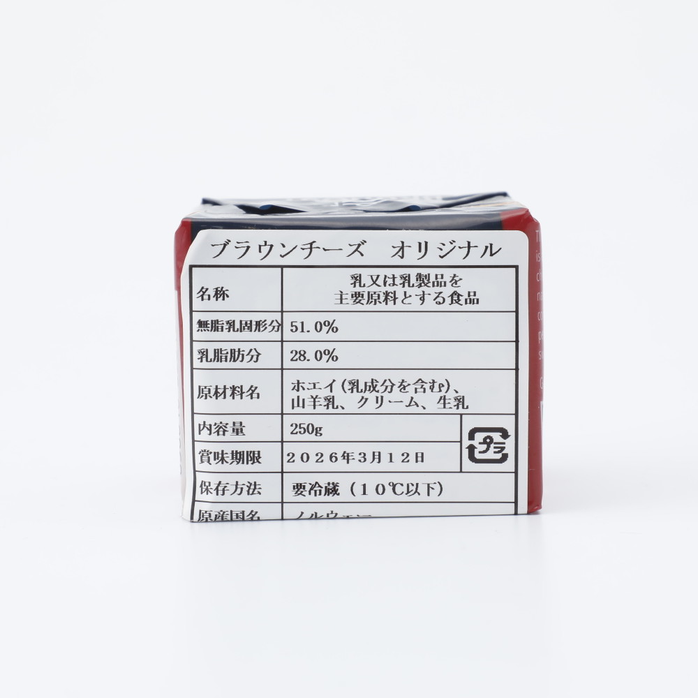 ノルウェーを代表する塩キャラメルのような味わいの通称「ブラウンチーズ」。山羊乳のホエイにクリームを添加して煮詰めて製造され色味とその味わいから「キャラメルチーズ」とも呼ばれる。
