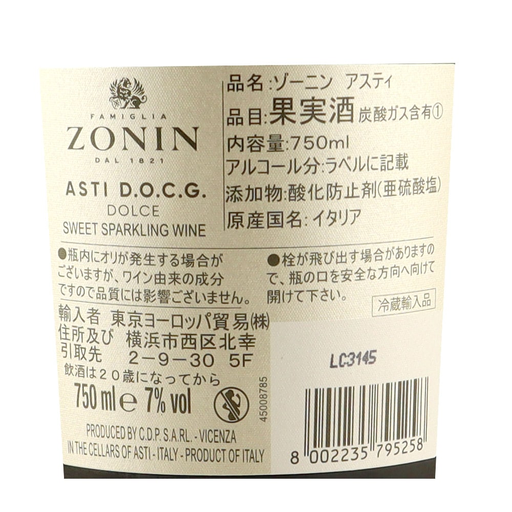 イタリアで最大規模を誇る、ヴェネト州の家族経営ワイナリー「ゾーニン」上質のマスカットを使用し、柔らかくすっきりとした甘さが特徴のスパークリングワイン