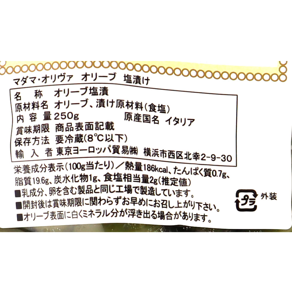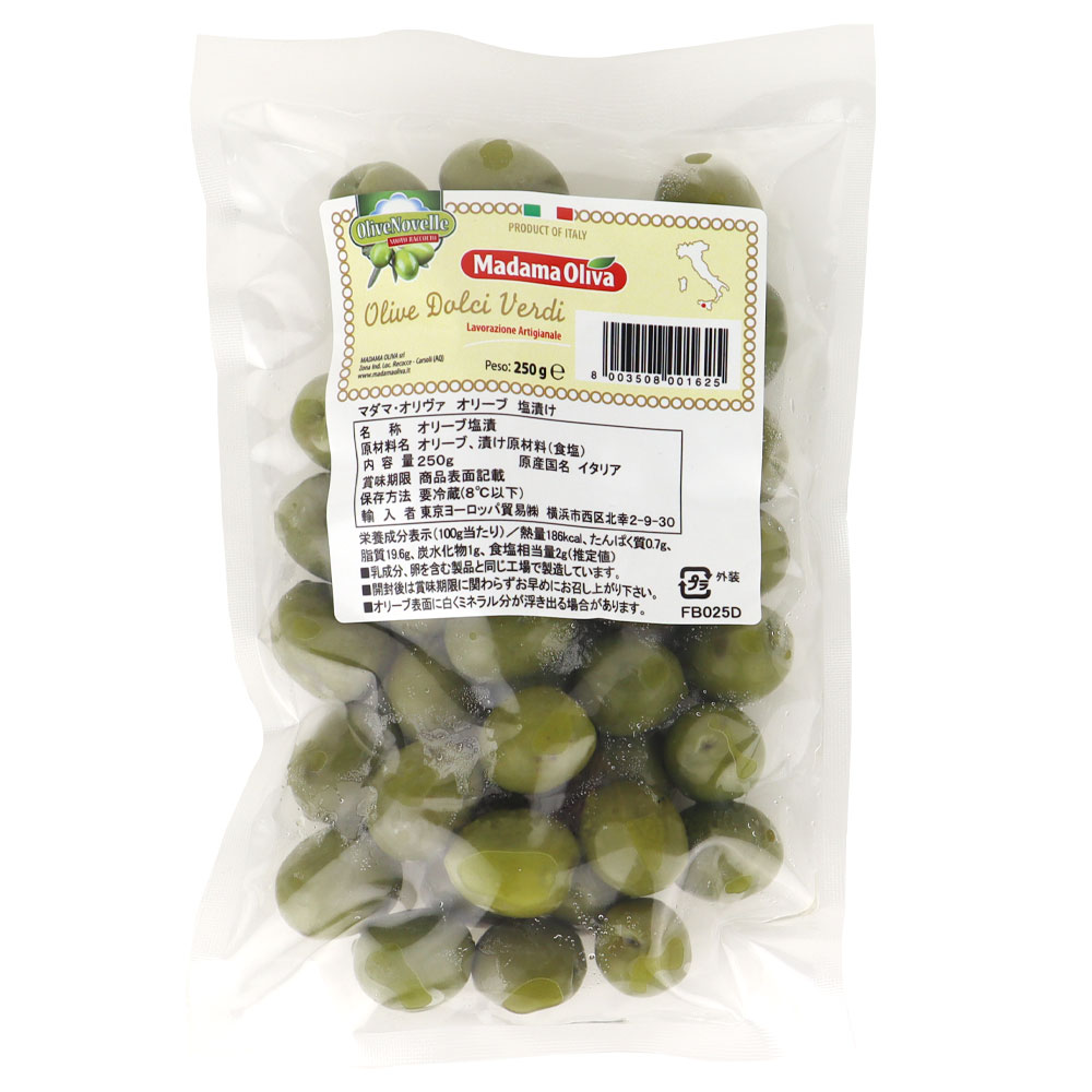 シシリー島ベリーチェ渓谷産グリーンオリーブの新漬。風味が強くしっかりとした歯ごたえがあるのが特徴です。