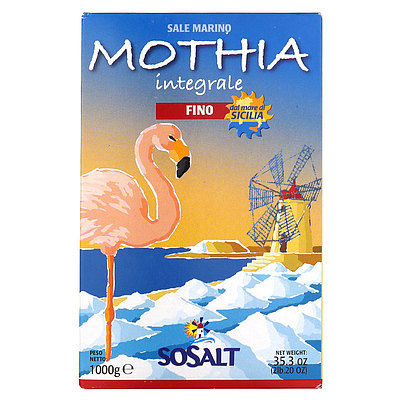 「モティア」はトラパニとマルサラの間に浮かぶ島の名前。インテグラーレ(無精製)のまま、天日で干しあげた海塩です。フィーノは細粒タイプ。