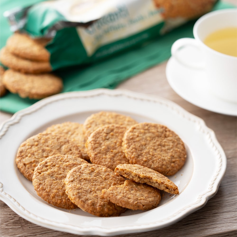 キャラメリゼしたライスパフとオーツ麦が入ったザクザク食感のビスケットです。