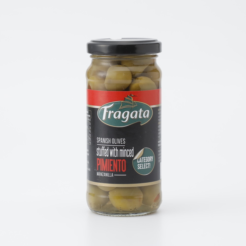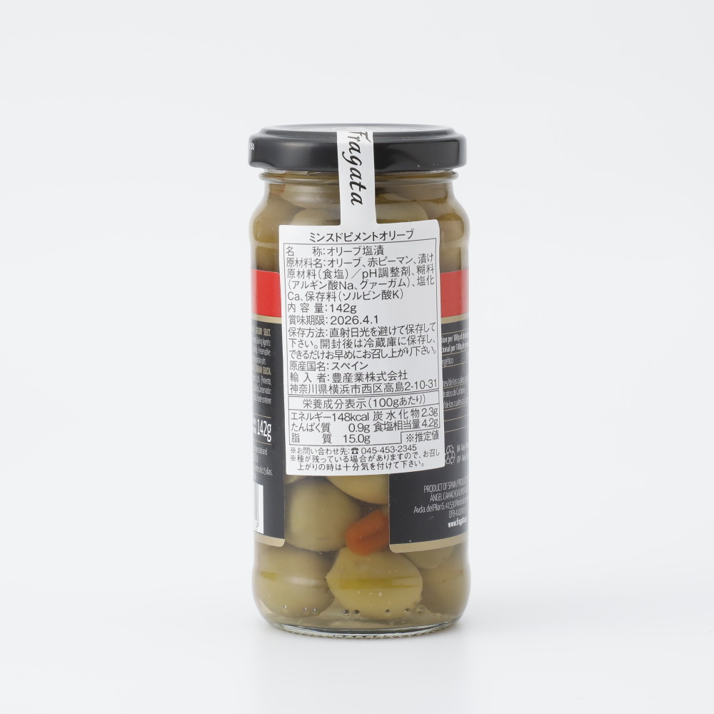 種を抜いたオリーブにピメント(アカピーマン)ペーストを詰めました。そのままおつまみとしてお召し上がりください。