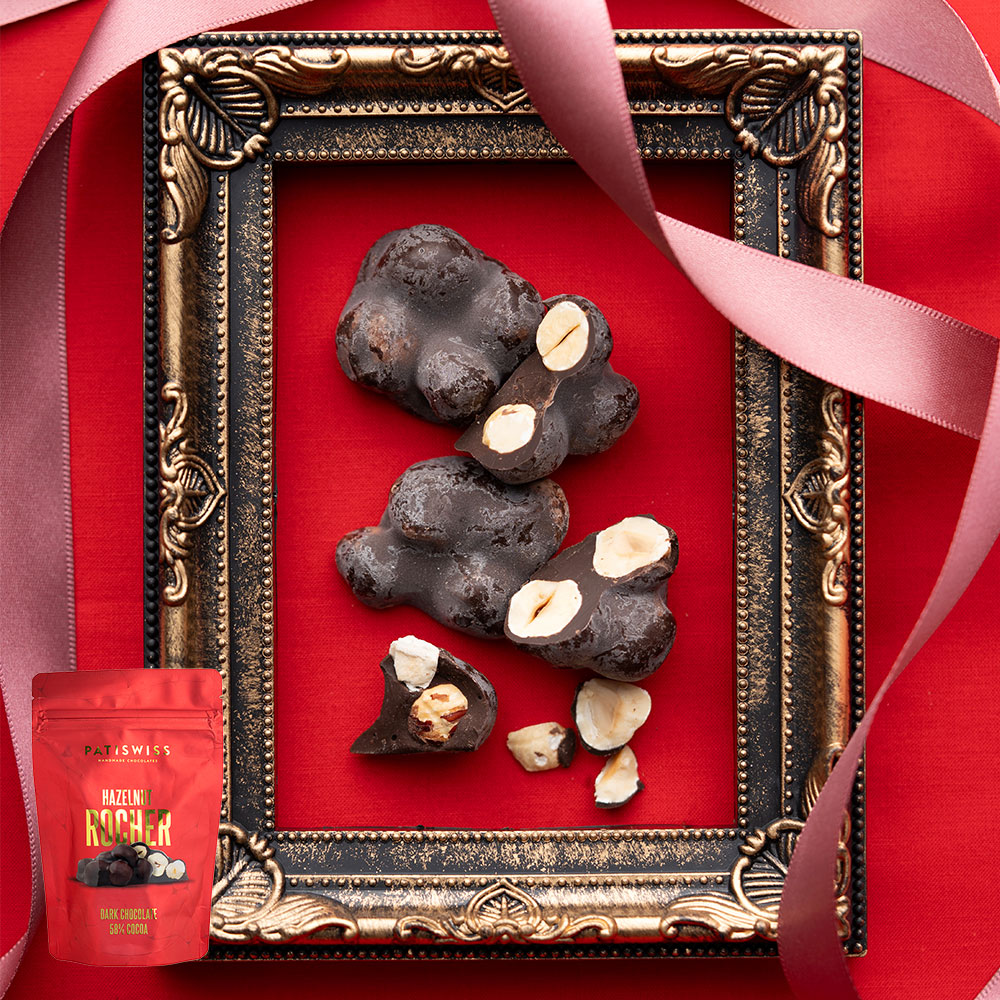 「ロシェ」とは、フランス語で「岩」や「岩山」を意味しています。ごろごろとしたヘーゼルナッツをまるごとチョコレートで固めました。