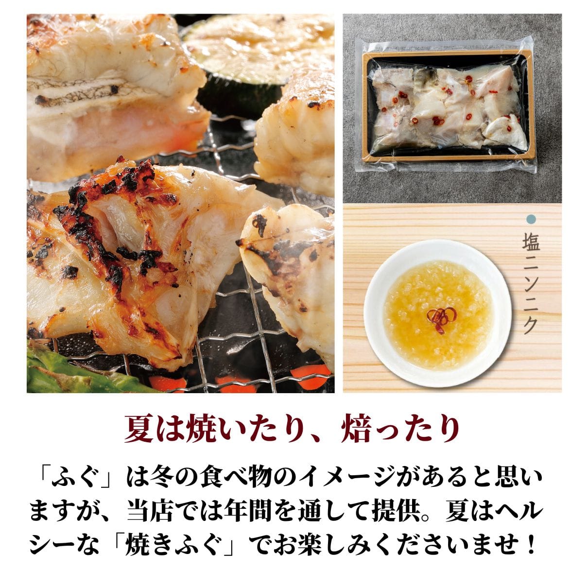 ニンニク入りの旨塩ダレが食欲をそそり、まるでお肉のようなジューシーさでありながら「とらふぐ」ならではプリプリの食感!