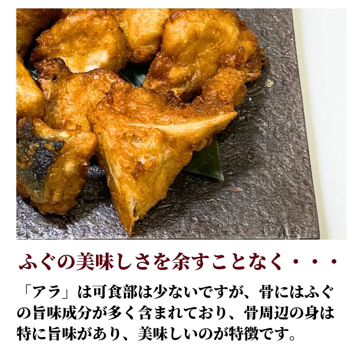 ※「骨付きとらふぐ」とは、捌く際に、フィレ部分を切り取った「アラ部分(お鍋などにも使用する部分)」になっております。可食部はフィレに比べると少ないですが、骨の周りの身は旨味が濃く、ふぐ独特の身の弾力を感じて頂けます。