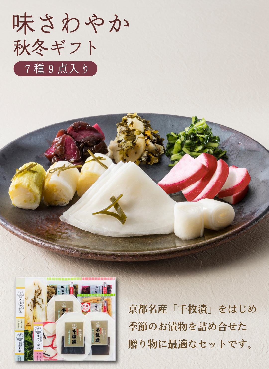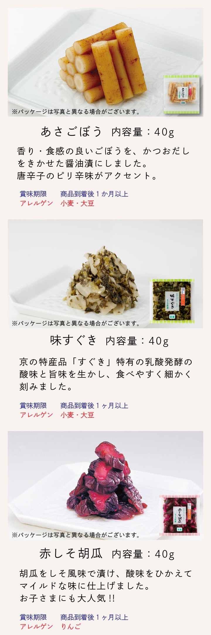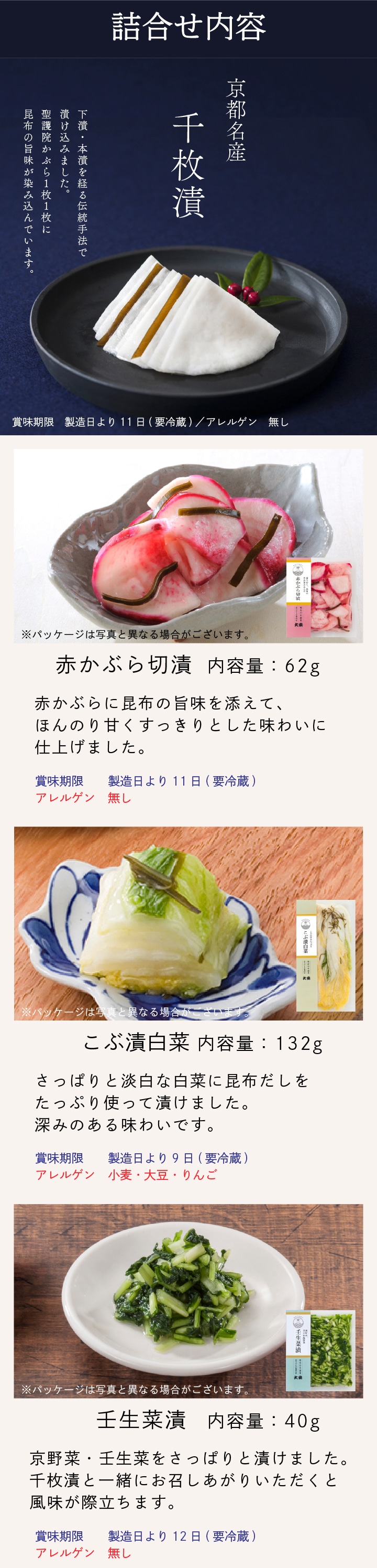 - 千枚漬70g×3、赤かぶら切漬62g、こぶ漬白菜132g、壬生菜漬40g、赤しそ胡瓜40g、あさごぼう40g、味すぐき40g