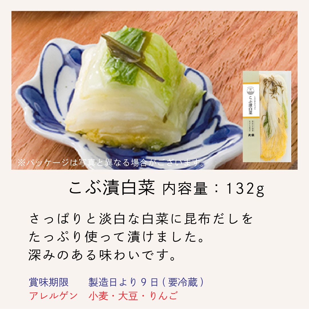 白菜、漬け原材料[還元水あめ、食塩、みりん、醸造酢、清酒、昆布エキス、りんご酢、昆布、しょうゆ、砂糖]/調味料(アミノ酸等)、(一部に小麦・大豆・りんごを含む)