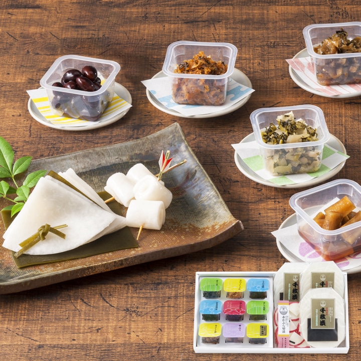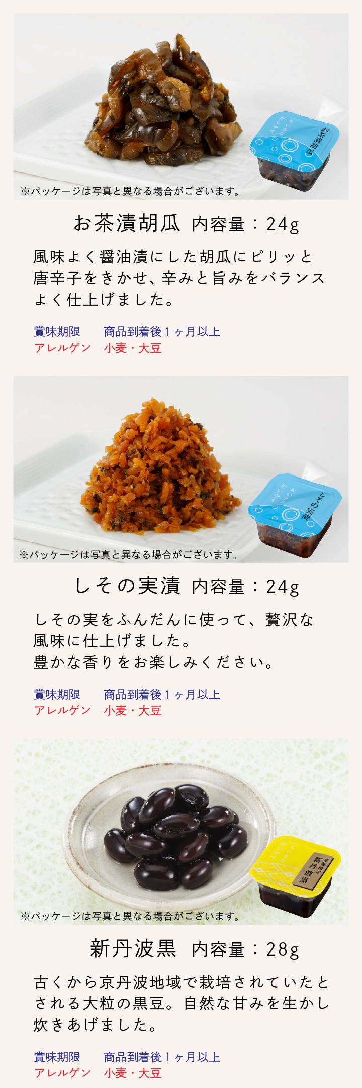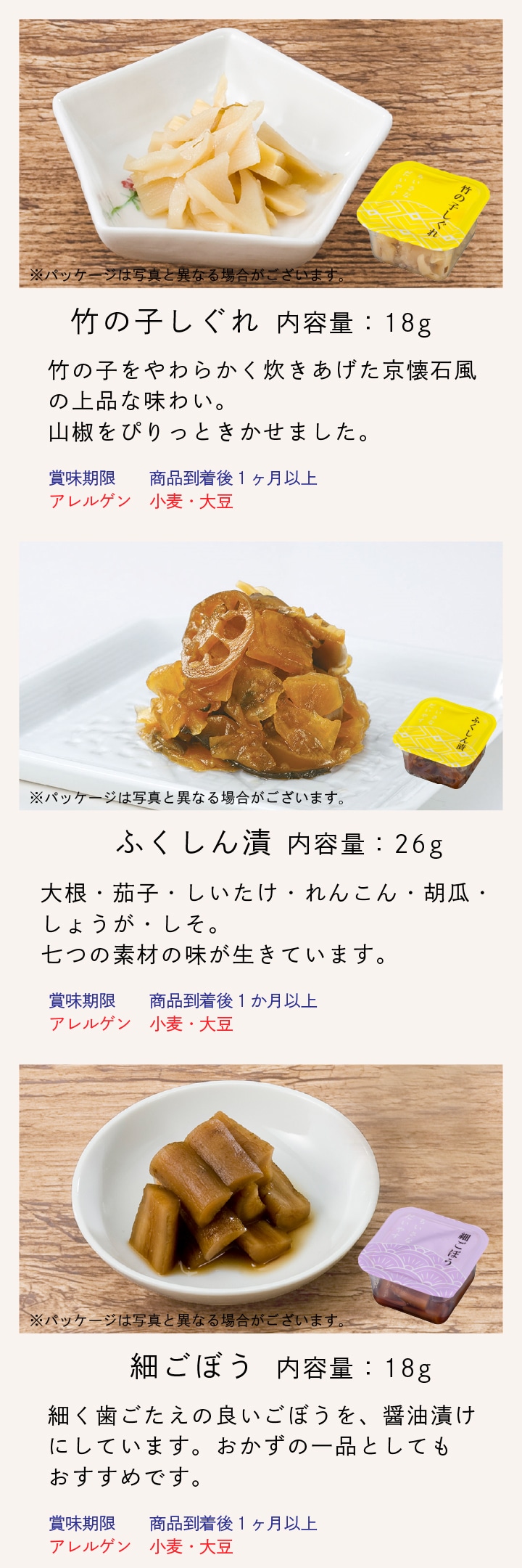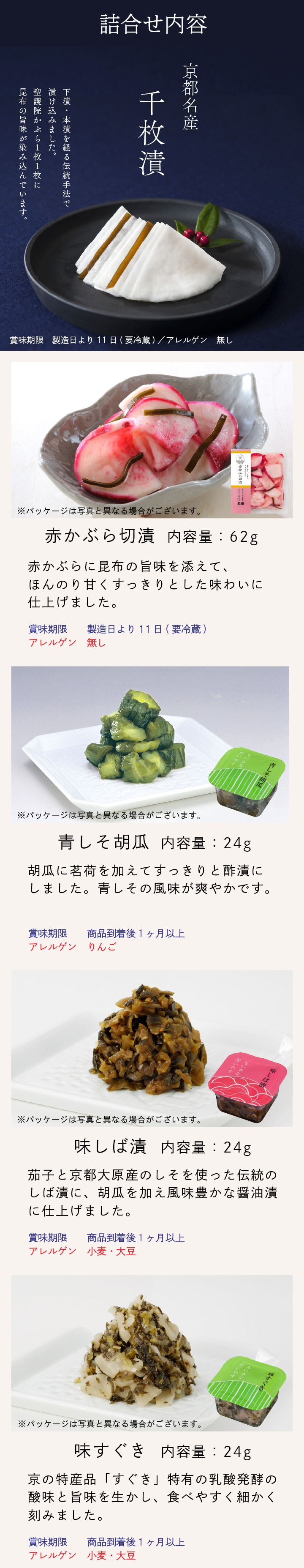 - 千枚漬70g×3、赤かぶら切漬62g、青しそ胡瓜24g、味しば漬24g、味すぐき24g、お茶漬胡瓜24g、しその実漬24g、新丹波黒28g、竹の子しぐれ18g、ふくしん漬26g、細ごぼう18g