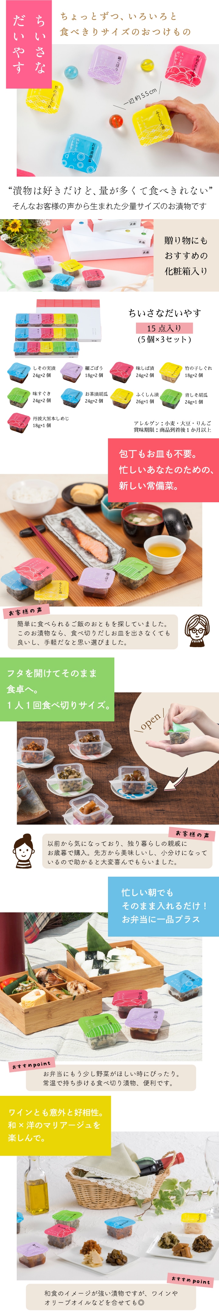 - 青しそ胡瓜24g、味しば漬24g×2、味すぐき24g×2、お茶漬胡瓜24g×2、しその実漬24g×2、竹の子しぐれ18g×2、丹波大黒本しめじ18g、ふくしん漬26g、細ごぼう18g×2