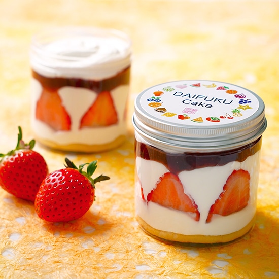 大人気のいちご大福を丸ごとボトルに入れ、まわりに生クリームといちごをあしらったケーキに仕上げました。