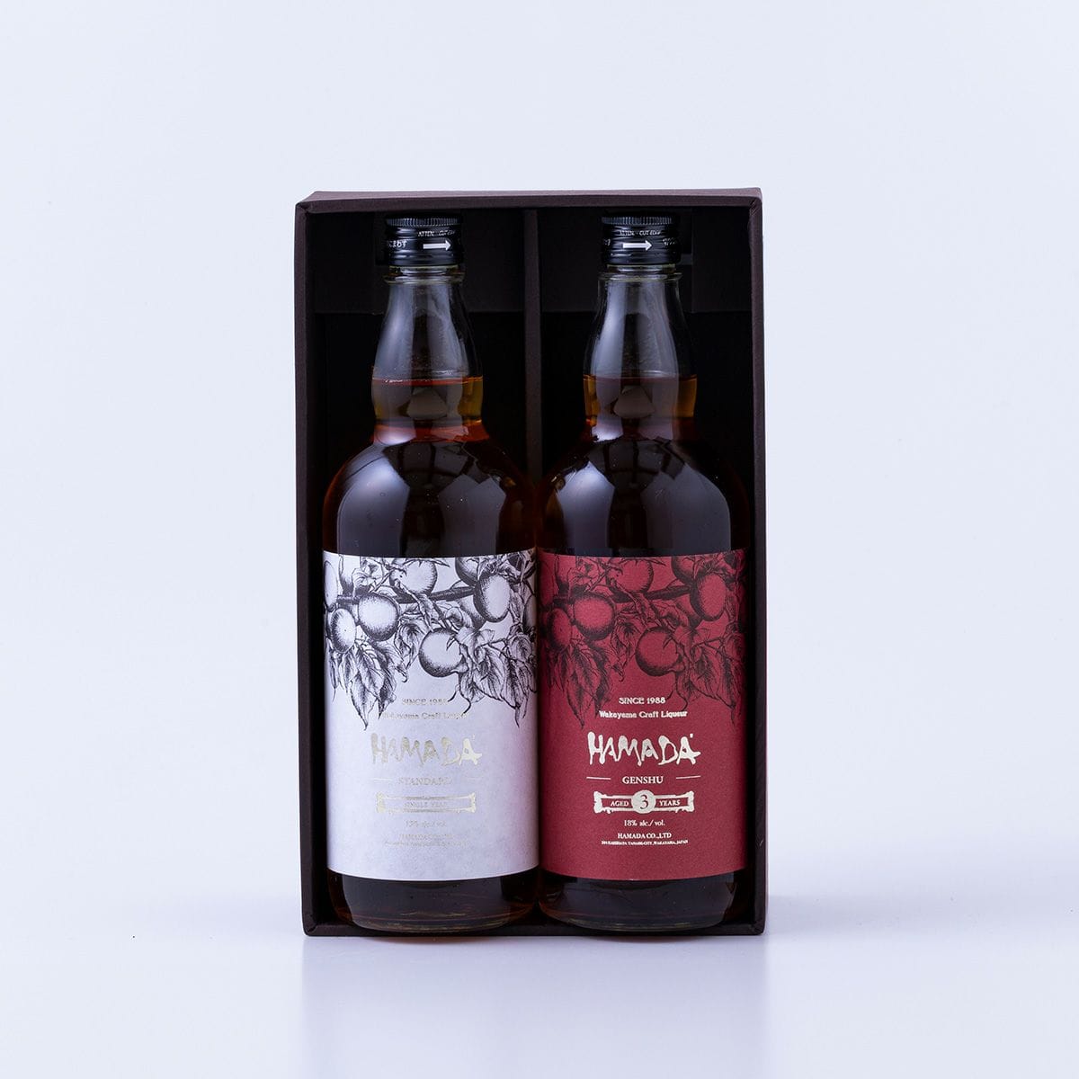 セット内容:梅酒「HAMADA」3年熟成 赤ラベル1本、梅酒「HAMADA」STANDARD 白ラベル1本