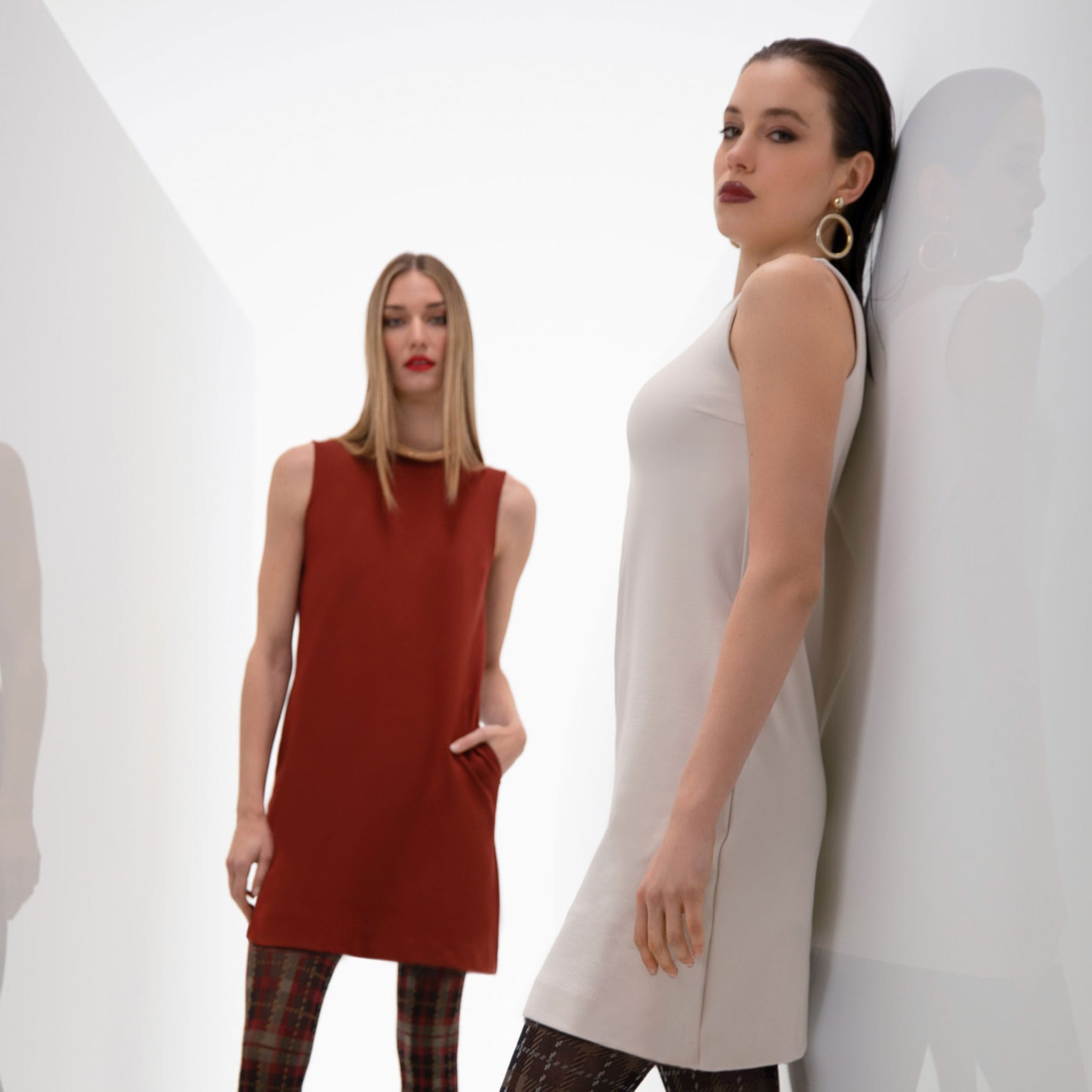 しっかりとした生地感にストレッチが加わった美しいシルエットのチュニックワンピース(かぶりタイプ・ポケット付き)