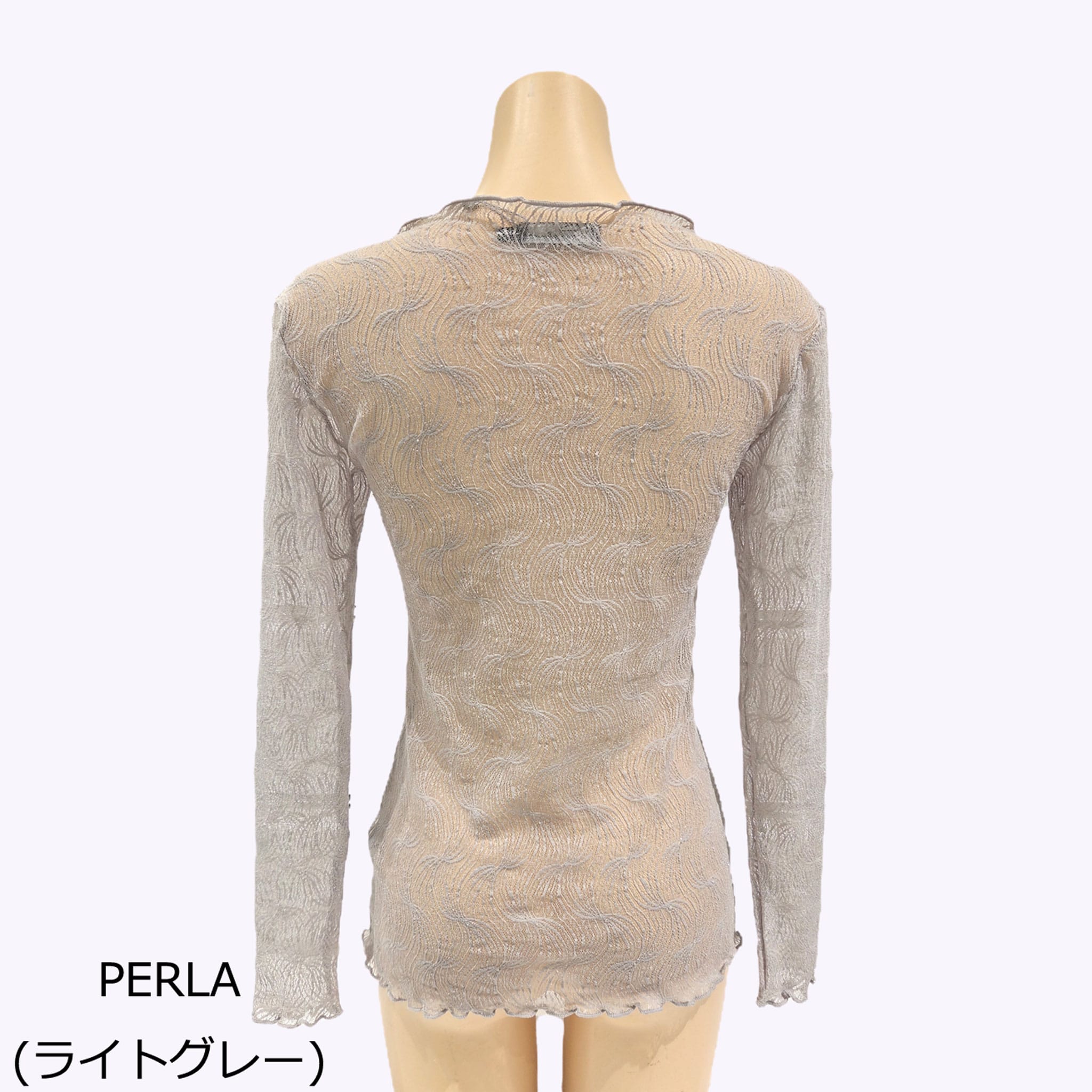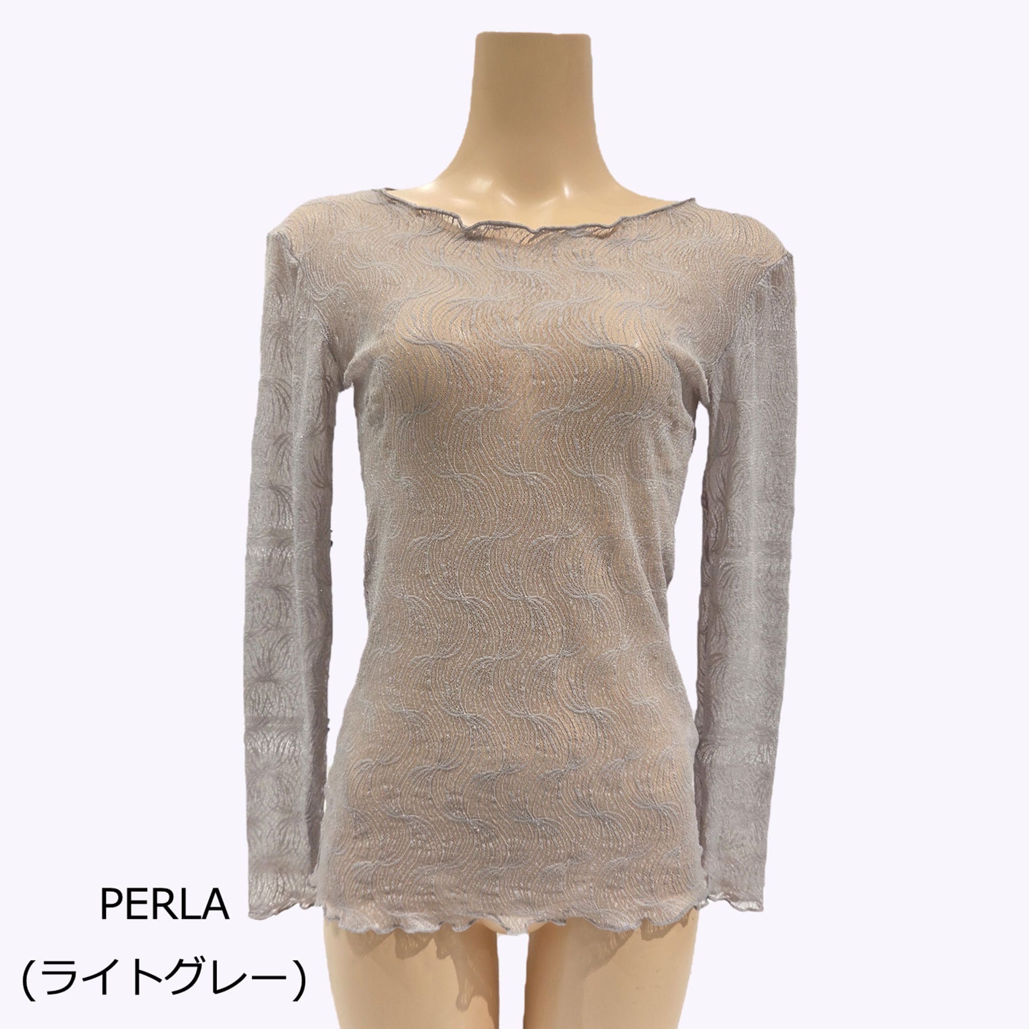 上質な着心地のイタリアンレース ジオメトリックレースのボートネック長袖 ニュアンスカラーのライトグレー