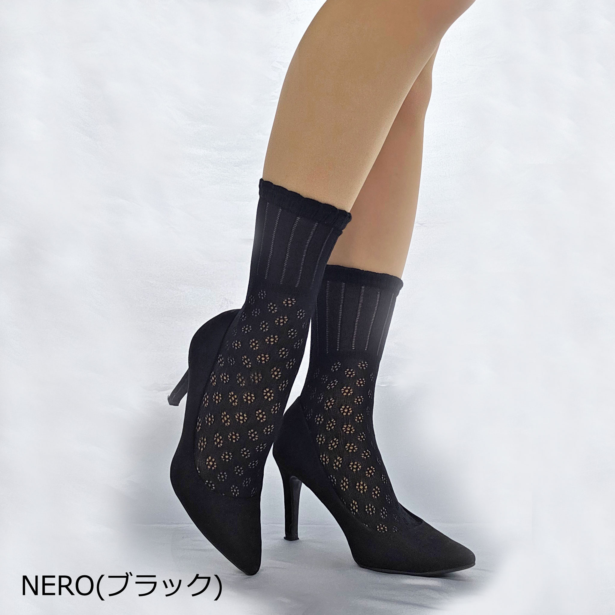 クローシェ刺繍からインスピレーションを得てデザインしたネットソックス 繊細な幾何学模様が特徴のルミ編みネット ルミ編みはニット素材の様に優しく肌触りの良い編み方で伸縮性もあり、肌に吸い付くようなフィット感で安心な履き心地 口ゴム部分もルミ編みなのできつく負担がかからず、ノンストレスで履けるデイリーソックス トレンドを常に発信し続けるミラノの老舗レッグウェアブランド<Pierre Mantoux ピエールマントゥー> 「女性の足を優しく包み込み、世界中で一番優雅で美しく、魅力的な足もとを演出する」というポリシーのもと 90年の歴史があるイタリアの最高級レッグウェアブランド、ピエールマントゥー 毎シーズン、パリ・ミラノコレクションの有名メゾンのレッグウェアを手掛け そのファッション性と品質の高さはヨーロッパ王族や各界のセレブリティをはじめ、世界中の女性から広く愛されています
