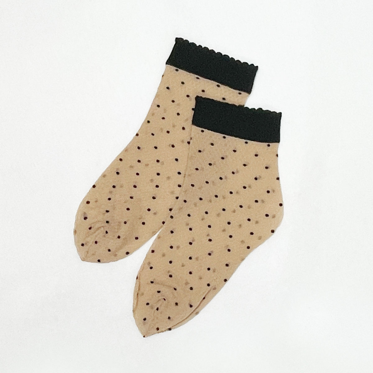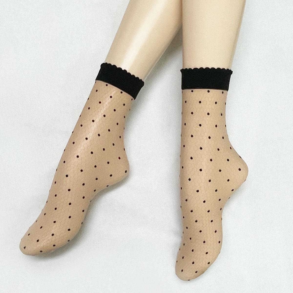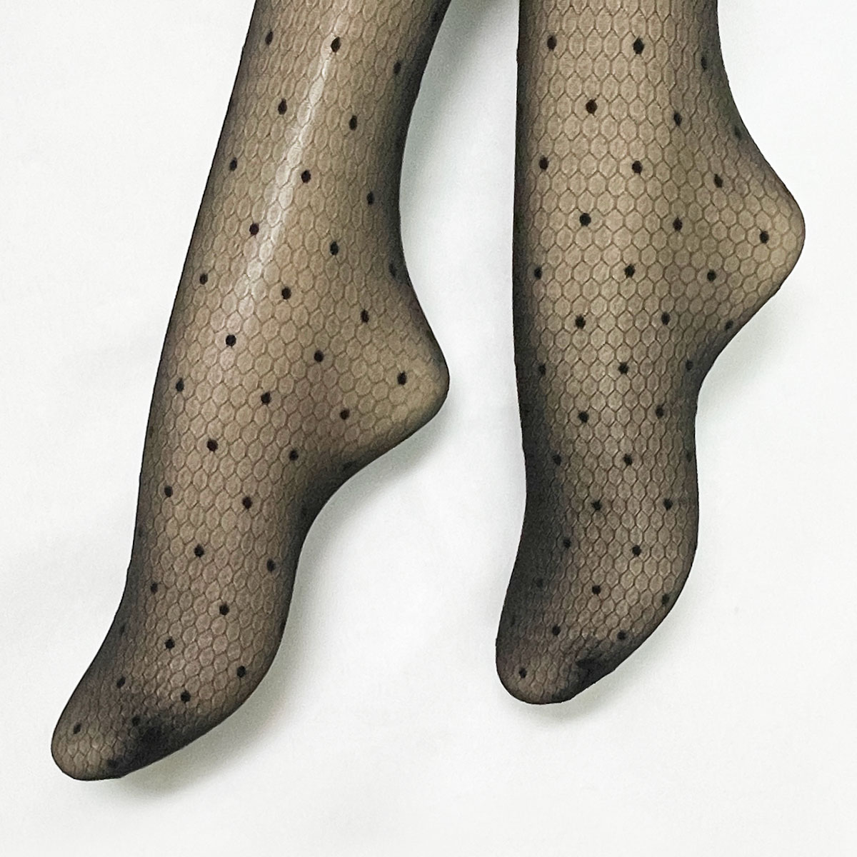 ドットがフェミニンな印象のショートソックス丈ストッキング 30デニールの細かいダイヤパターンベースに入れた絶妙なドットの大きさと間隔にこだわったレディライクな一足