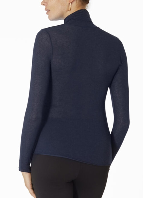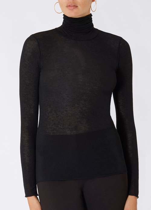 カシミヤとビスコースを使用したタートルネックセーターで、体にやわらかく密着する細かな伸縮性と抜群のなめらかさ