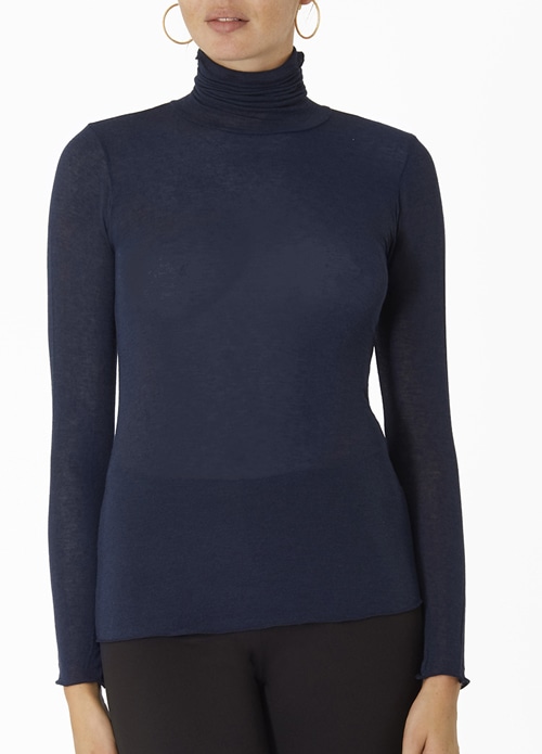 カシミヤとビスコースを使用したタートルネックセーターで、体にやわらかく密着する細かな伸縮性と抜群のなめらかさ