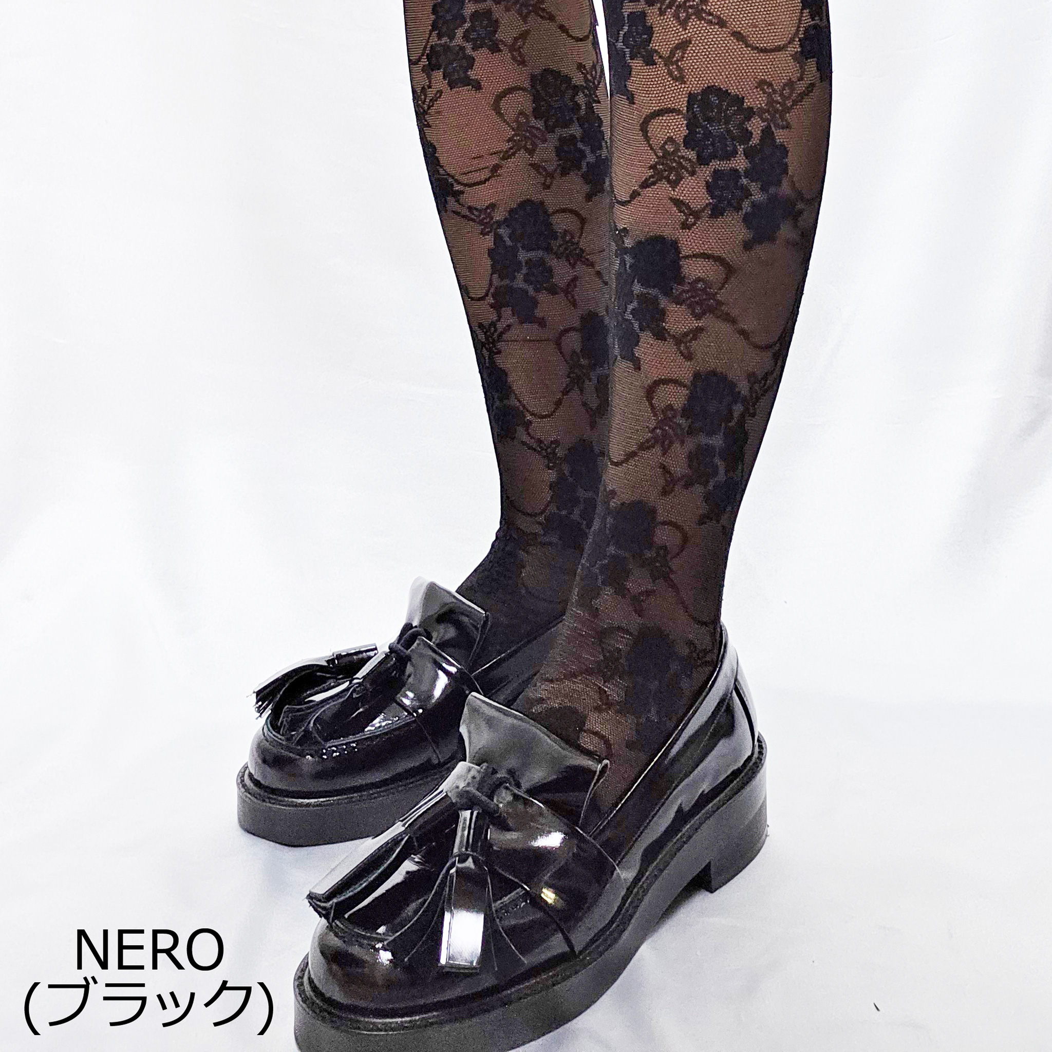 繊細な花柄を施し、春の香り漂うエレガンスを演出したストッキング素材のハイソックス