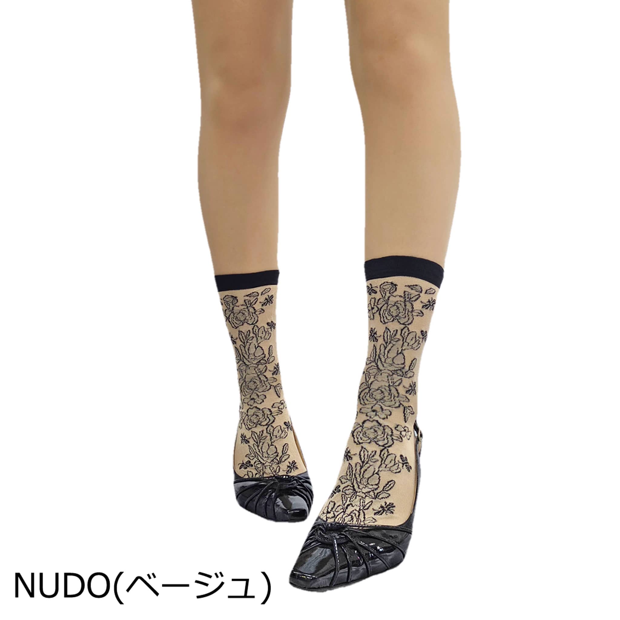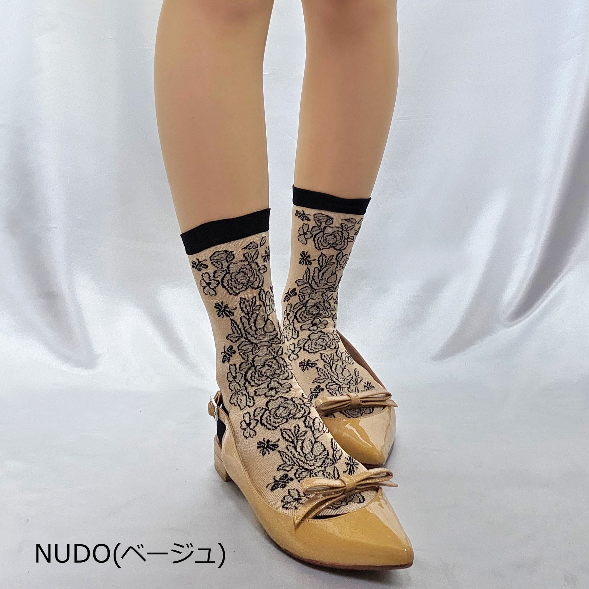バラ・ミツバチ・蝶のモチーフをあしらったジャガード織りシアーソックス