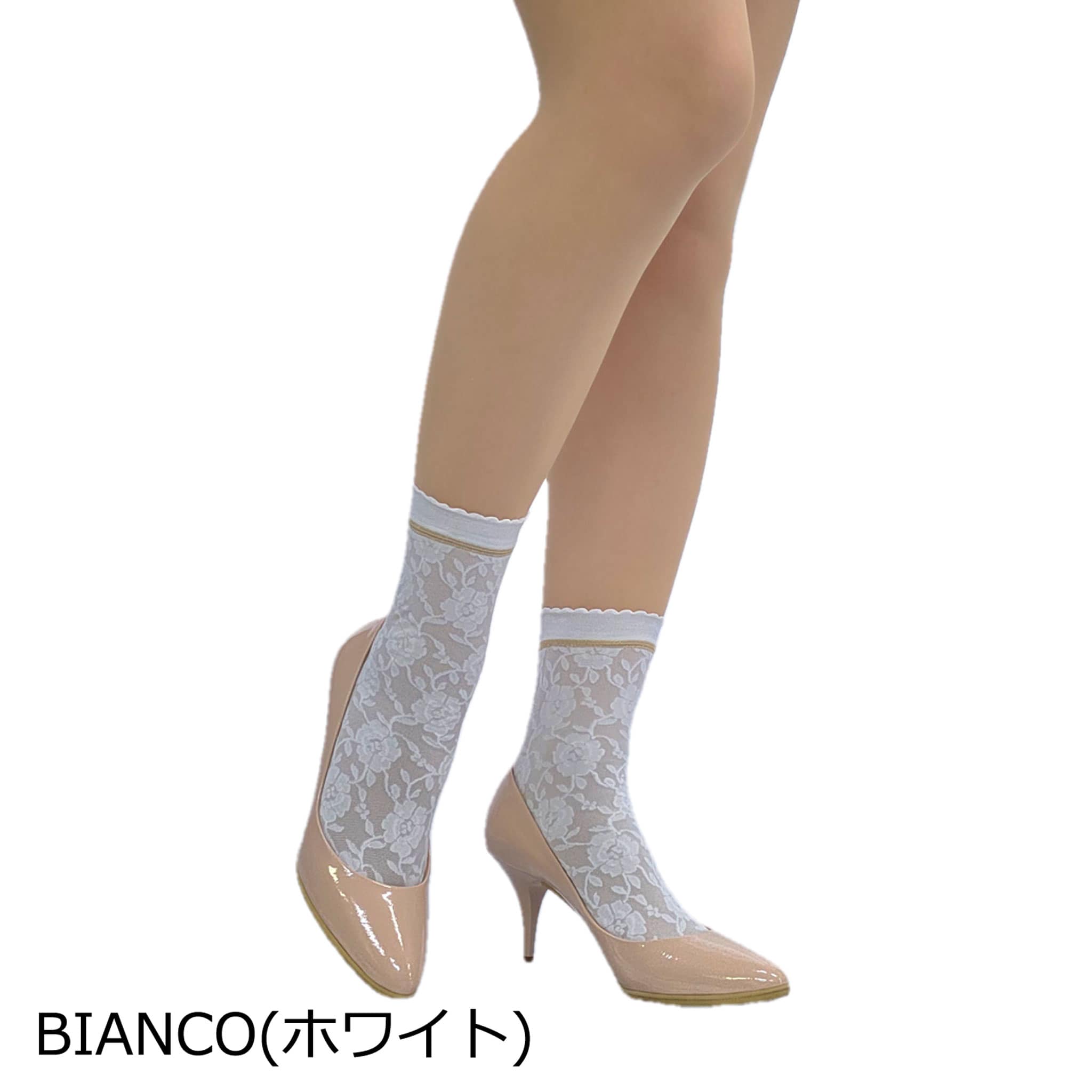 ジャガードレースにバラモチーフの花をあしらい、上部のゴールドラインがポイントのソックス