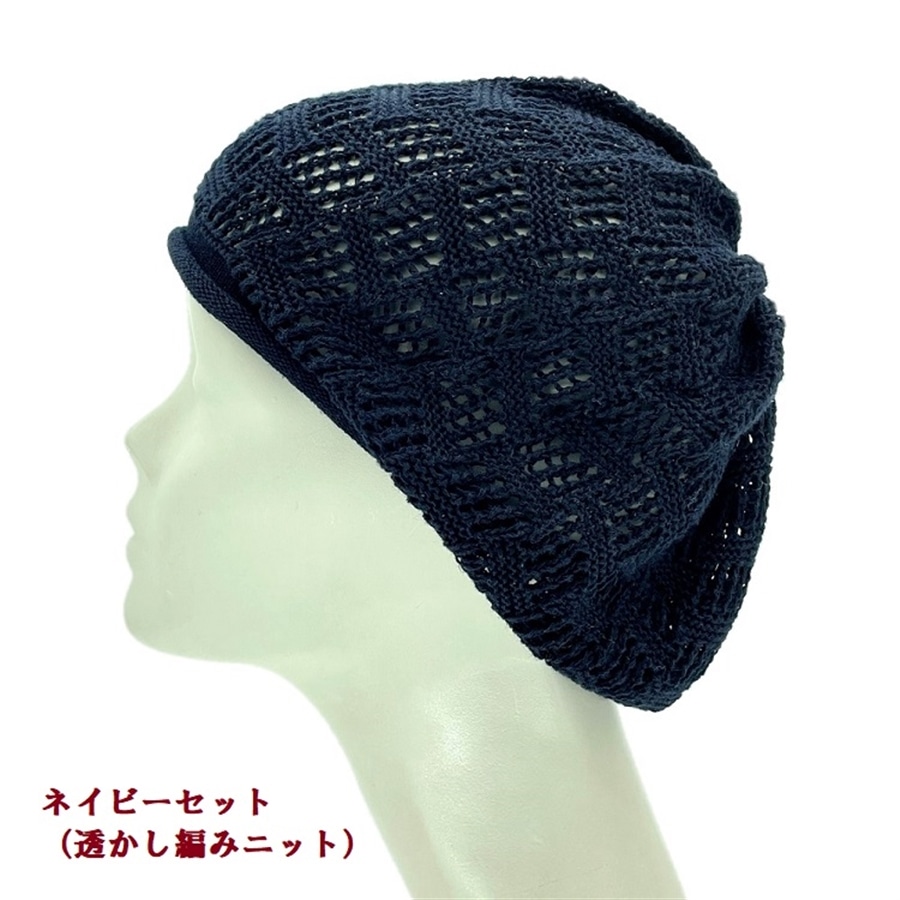 ●室内でもかぶりやすい軽やかなニットワッチを、デザイン違い2枚セットで。涼やかな透かし編みデザインと、シンプルな無地デザイン。1枚ずつでも、重ねても、シーンに合わせて楽しめます。