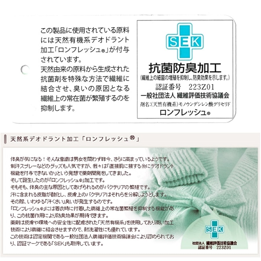 ●どちらも、天然系抗菌防臭加工「ロンフレッシュ®加工」を付与した糸を使用。皮膚上のバクテリア増殖により発生するにおいを減少させる効果があります。
