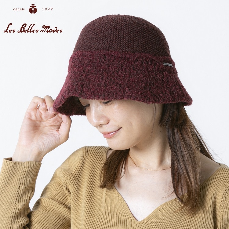 ●つば部分は、大きめのレース模様をあしらった温かみのあるデザイン。使用しているブークレーヤーンは、ループに空気を多く含む構造なので、軽くてしなやか。ベビーアルパカとウールの2種類をミックスすることで、奥行きのある色合いになっています。