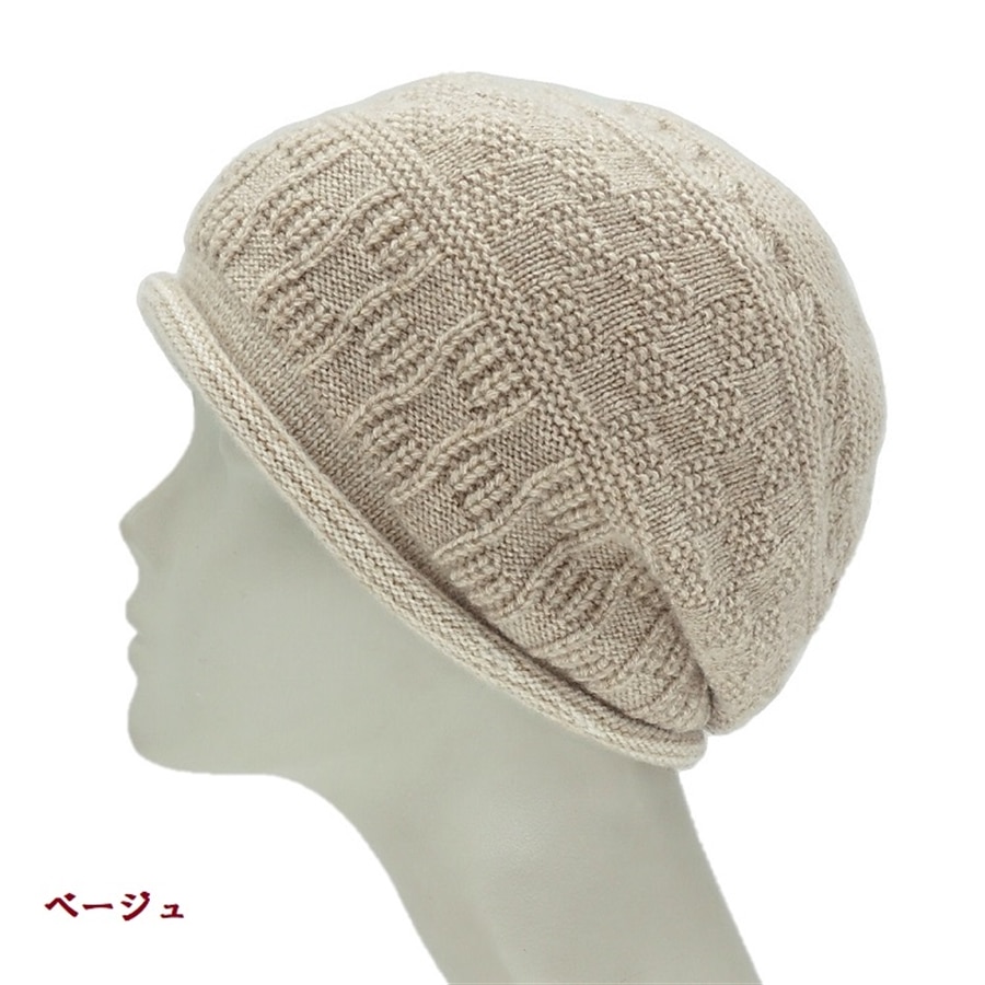 ●編み目の凹凸を活かした地模様柄。被り口の配色ボーダーがアクセントのシンプルなデザインです。