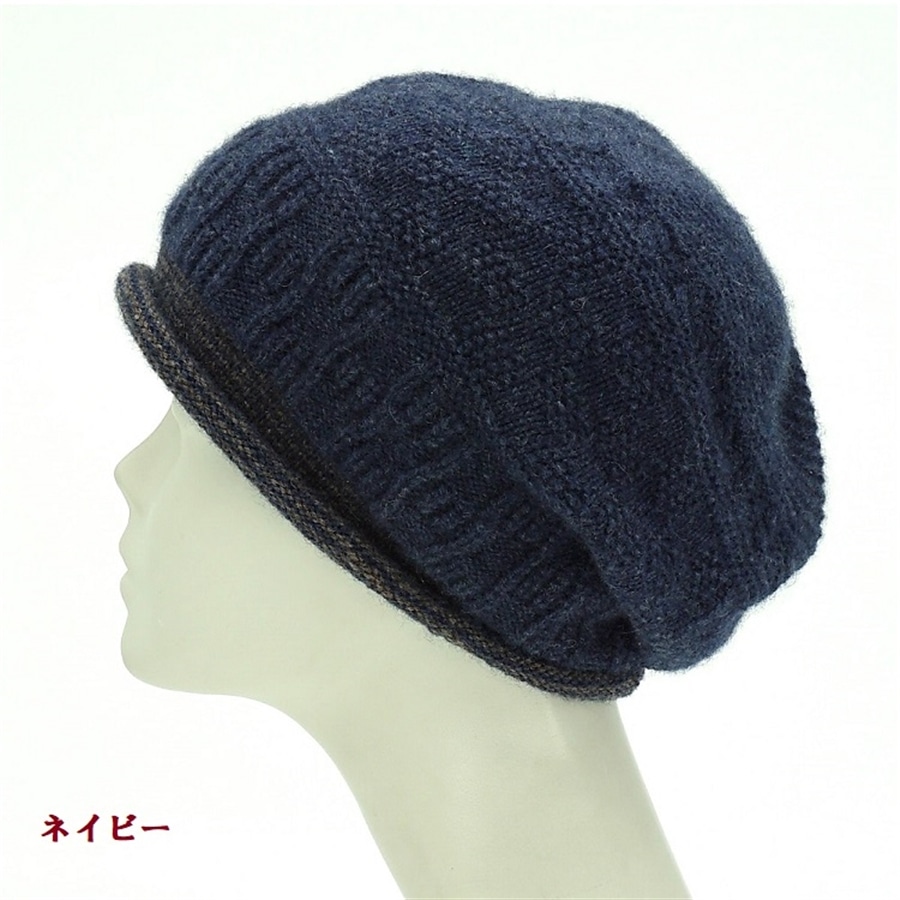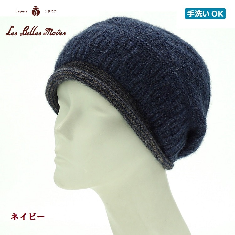 ●編み目の凹凸を活かした地模様柄。被り口の配色ボーダーがアクセントのシンプルなデザインです。