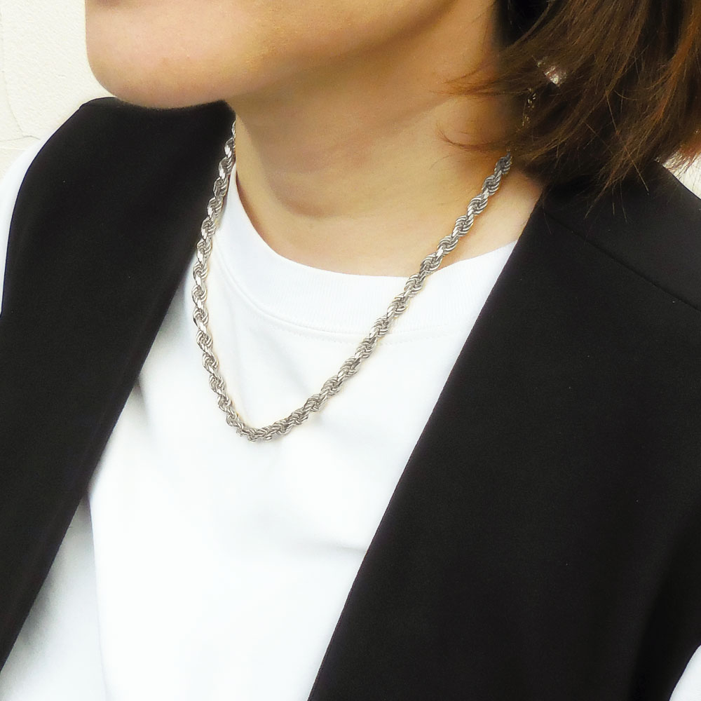 ロープのようにツイストさせた見た目が印象的なチェーン。側面には平面カットがあるので、身に着けている時もところどころが一瞬光を強く反射して、とてもきらびやかな印象です。