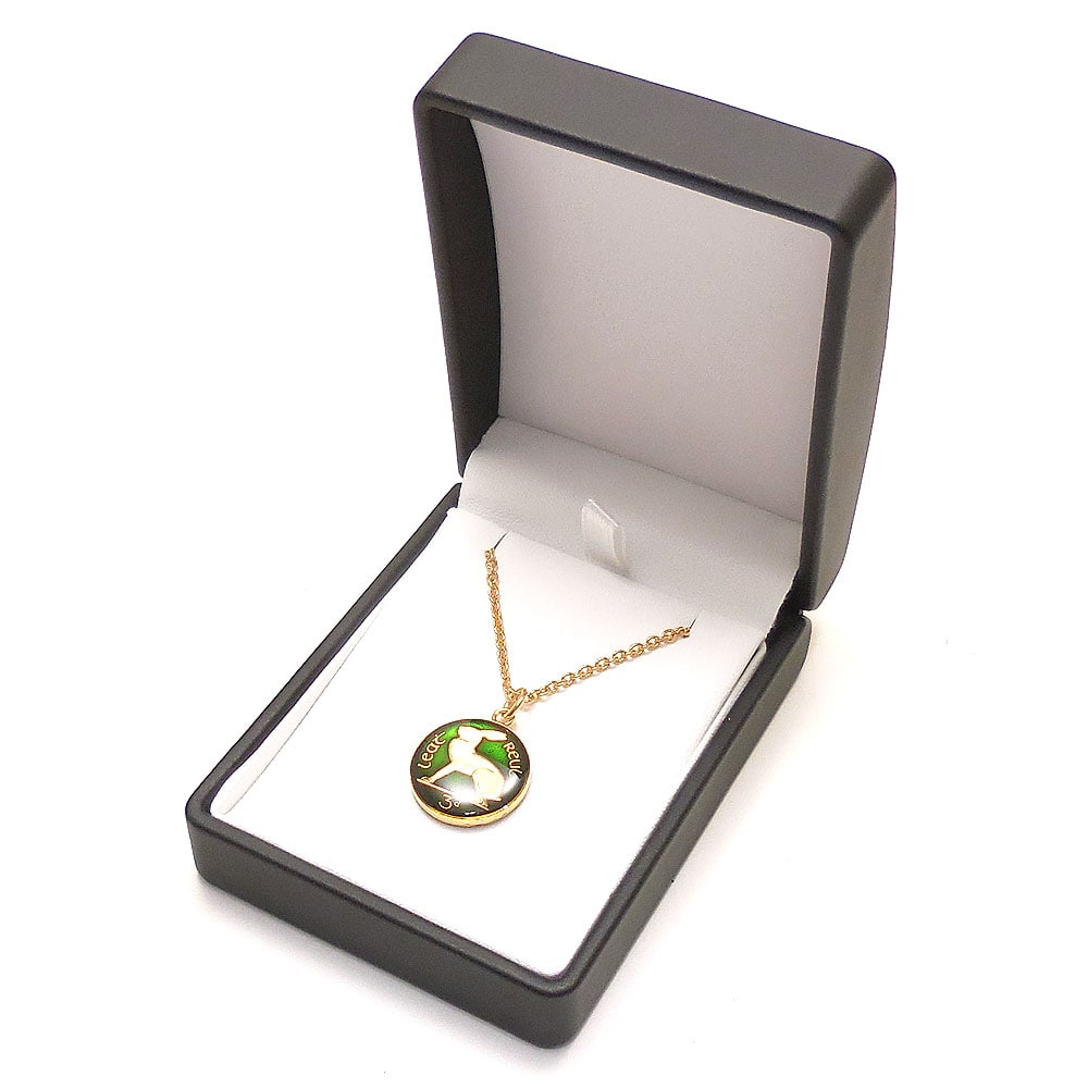 表は、アイルランドでよく見られる野生動物、野うさぎ。跳ねる姿から「飛躍」、子だくさんなことから「繁栄」の象徴とされています。そして、アイルランドの国花であるシャムロックを思わせる、グリーンのエナメルによる色乗せ。見る角度によって、濃いグリーンから若草のような鮮やかなグリーンに変わり、まるで風で波打つ草原のようです。