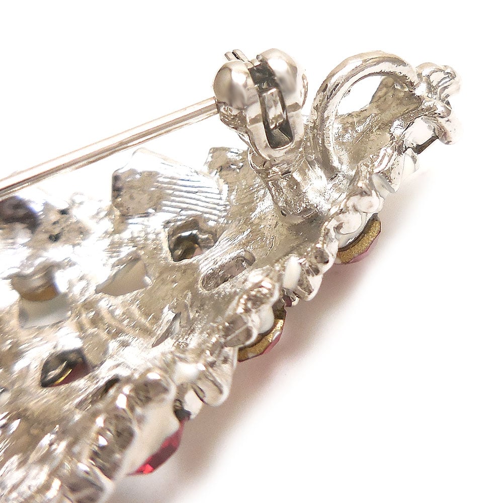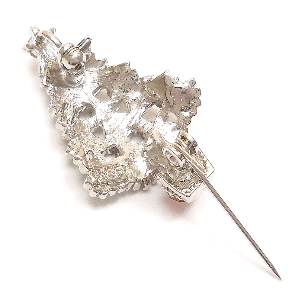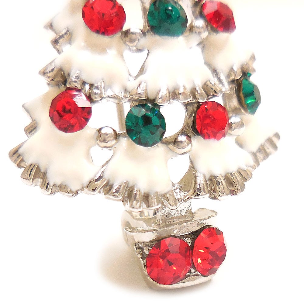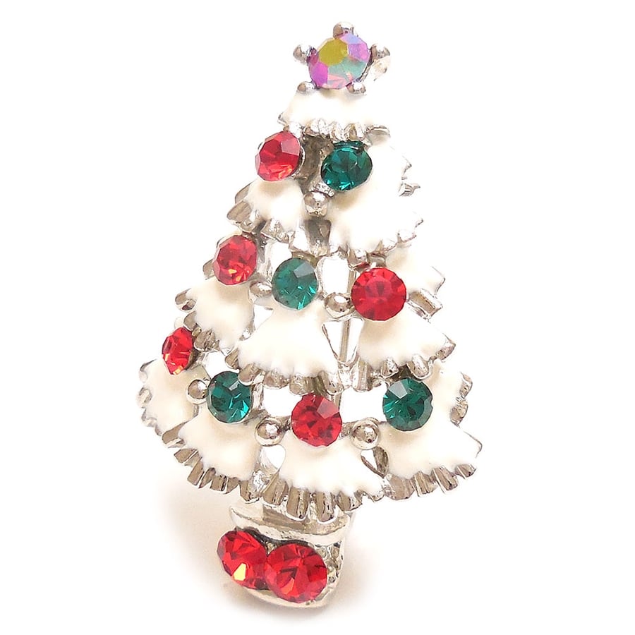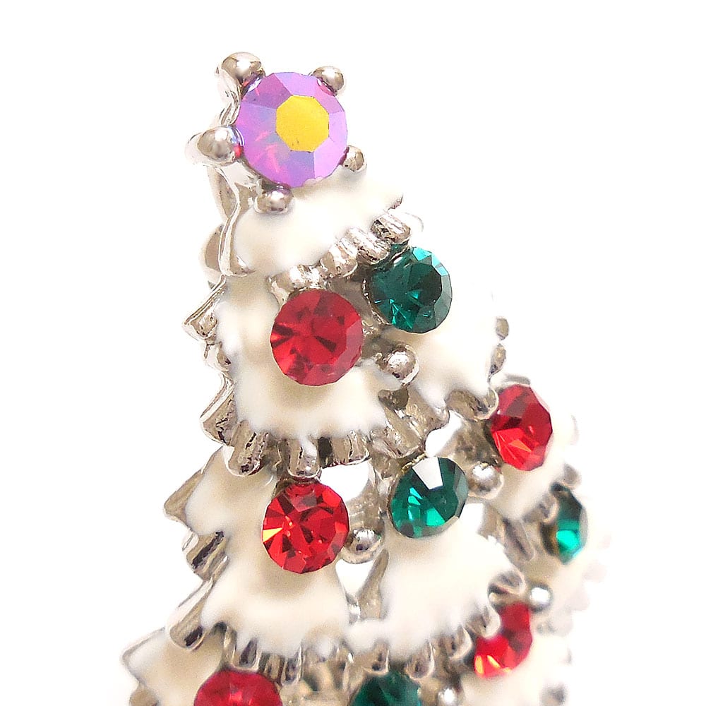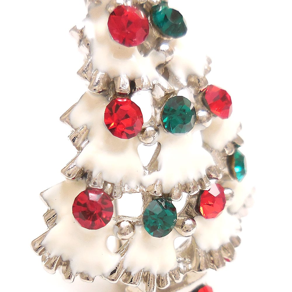 雪の積もったツリーに、クリスマスカラーの赤と緑のデコレーションが映える、クリスマスムードいっぱいのブローチ。