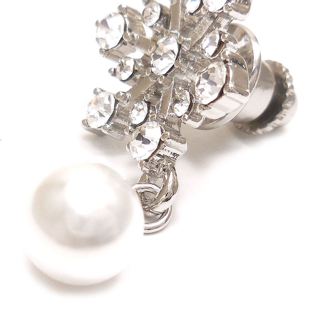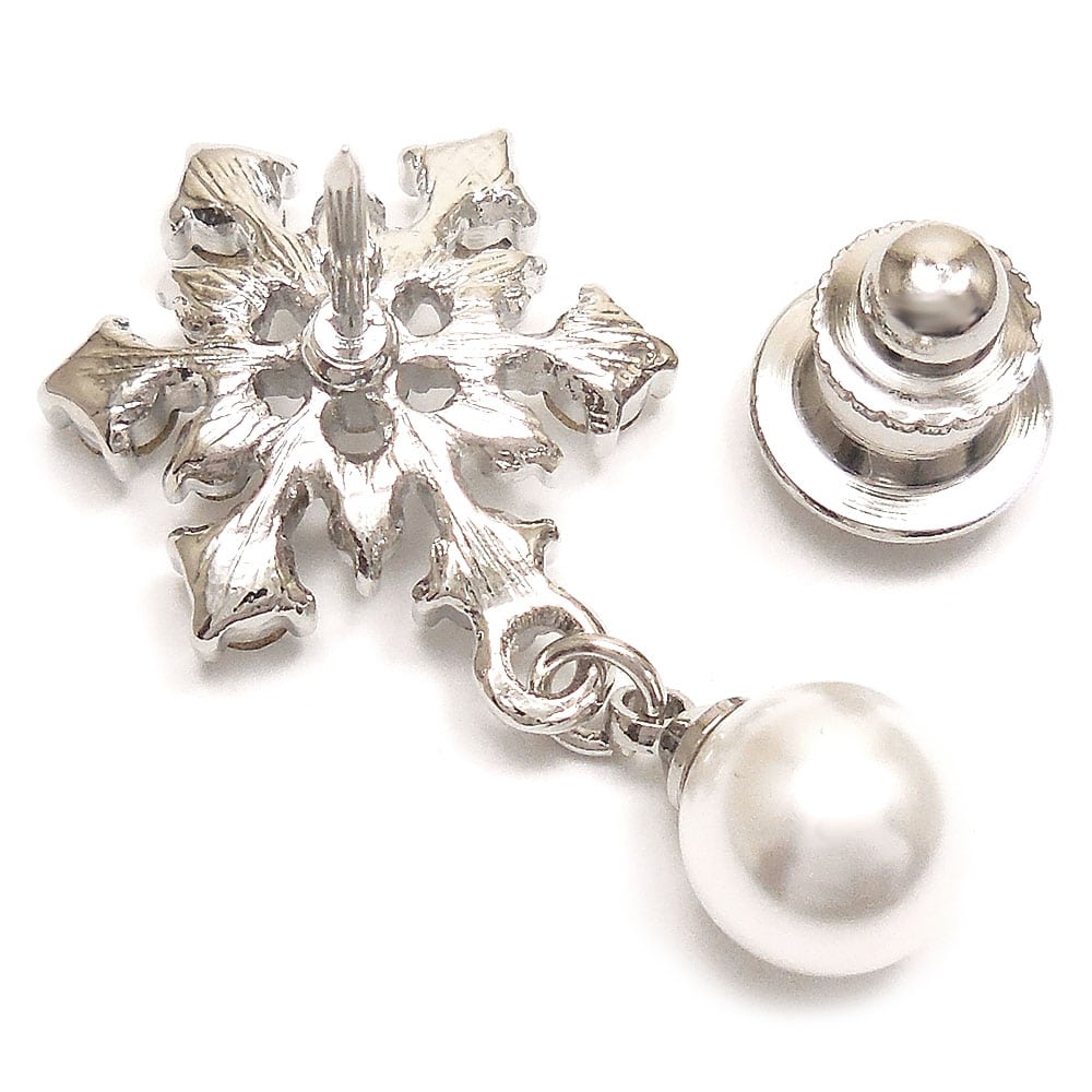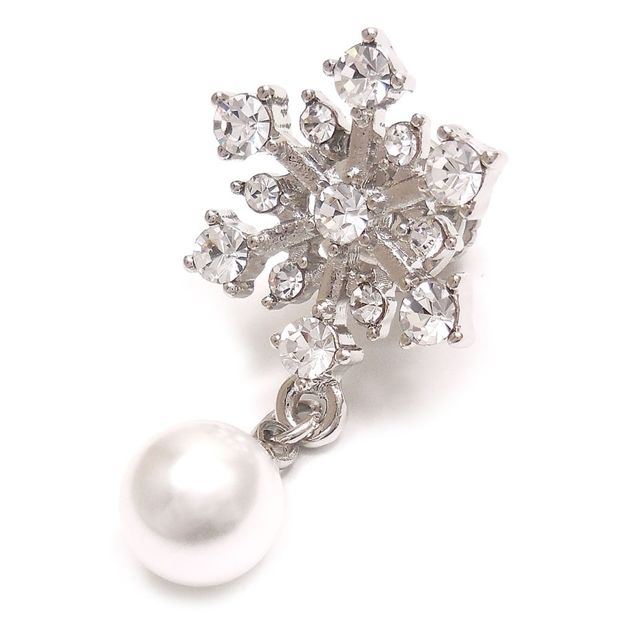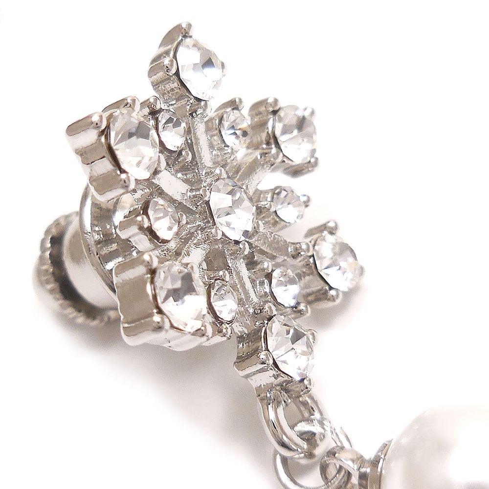 シルバーカラーベースに、クリアのクリスタルガラスがきらめきます。下部には雪玉を思わせるイミテーションパールがゆらゆらと揺れて目を引きます。