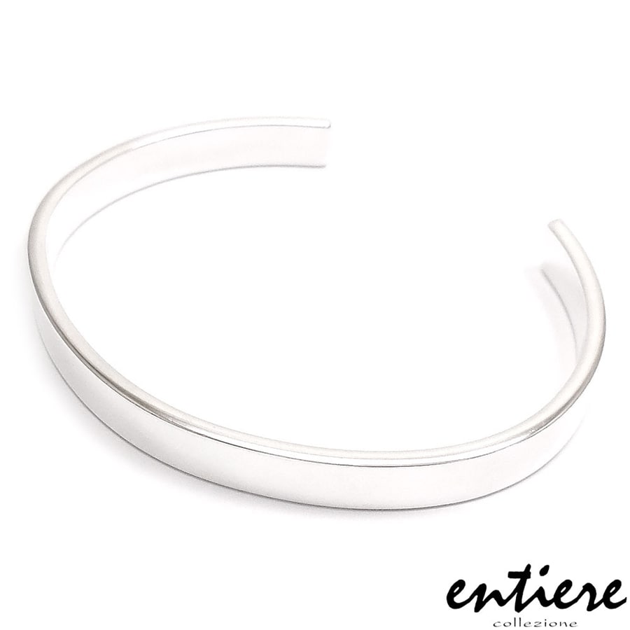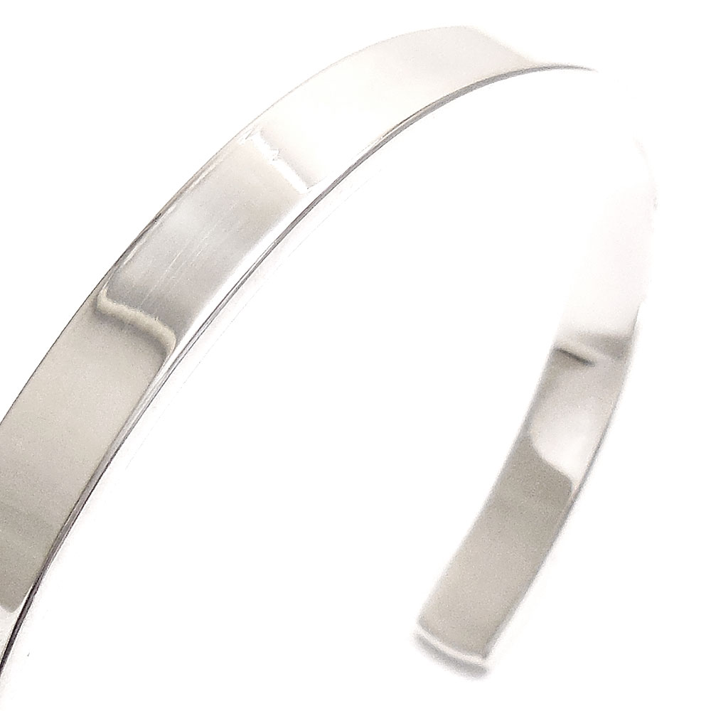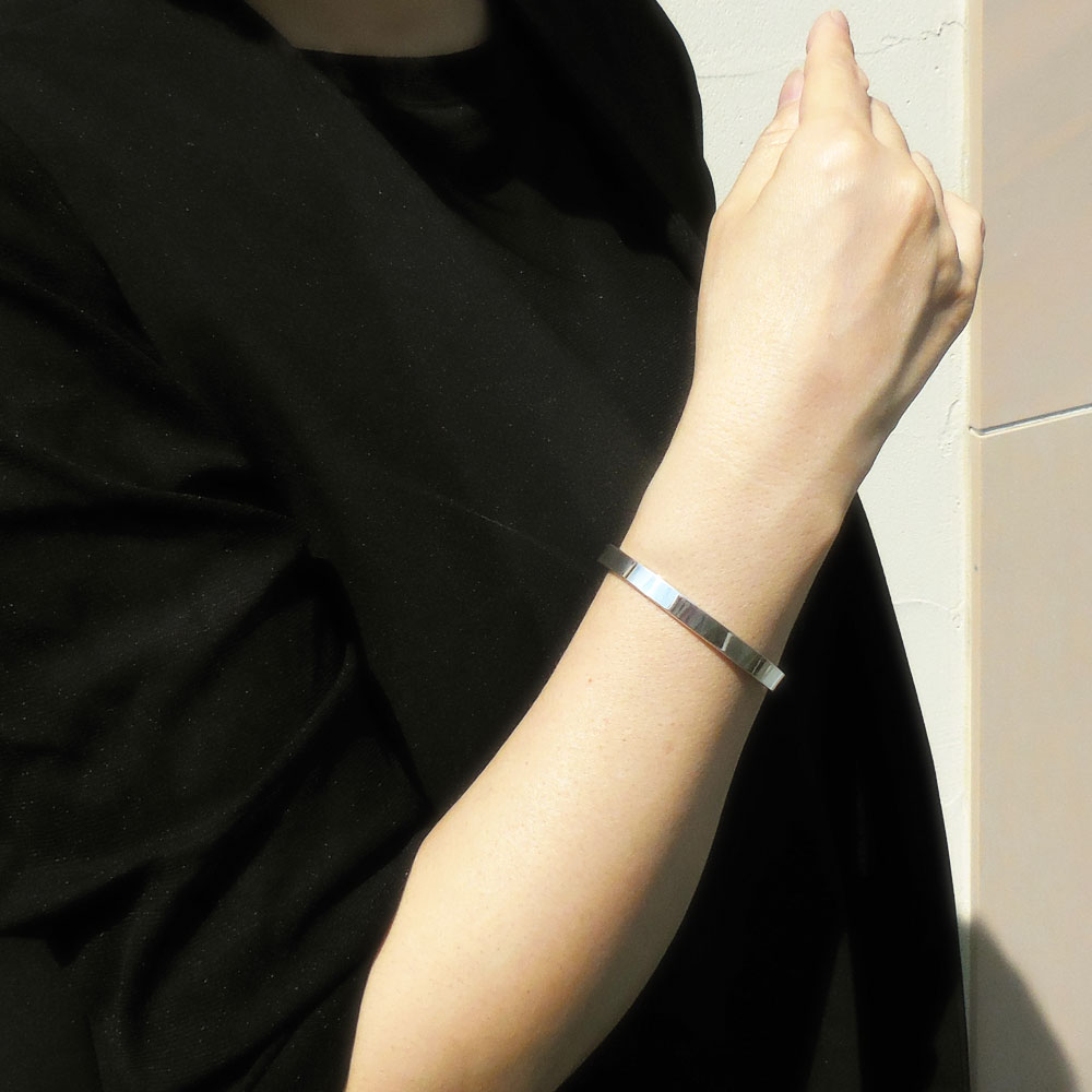 幅約5.5mm、装飾などがなく、平らな鏡面は反射率の高いシルバーでより一層シャープな輝きに。中空ではないので、身に付けるとちゃんと銀の重さを感じます。