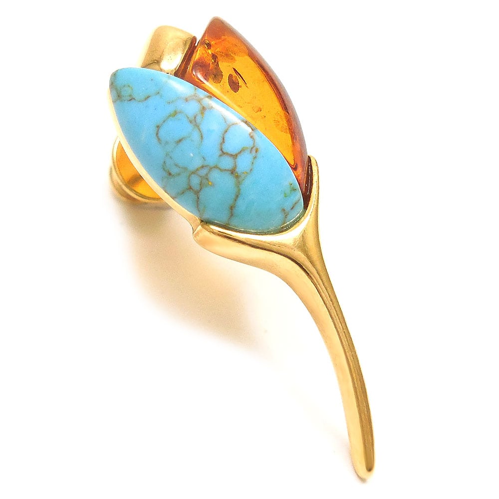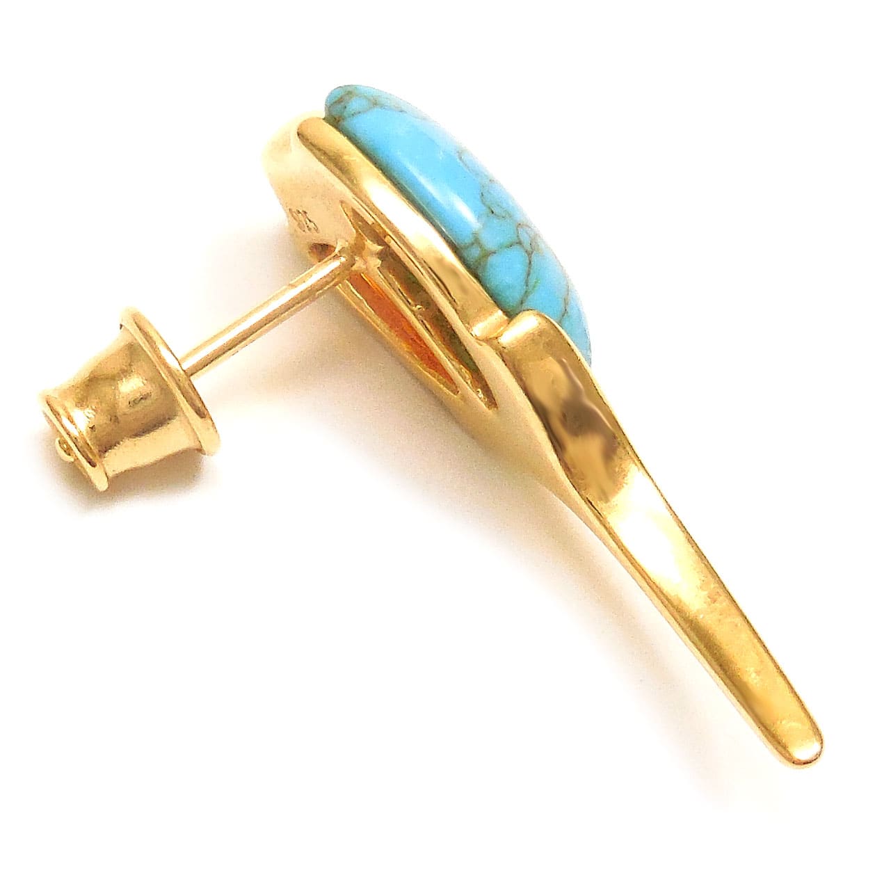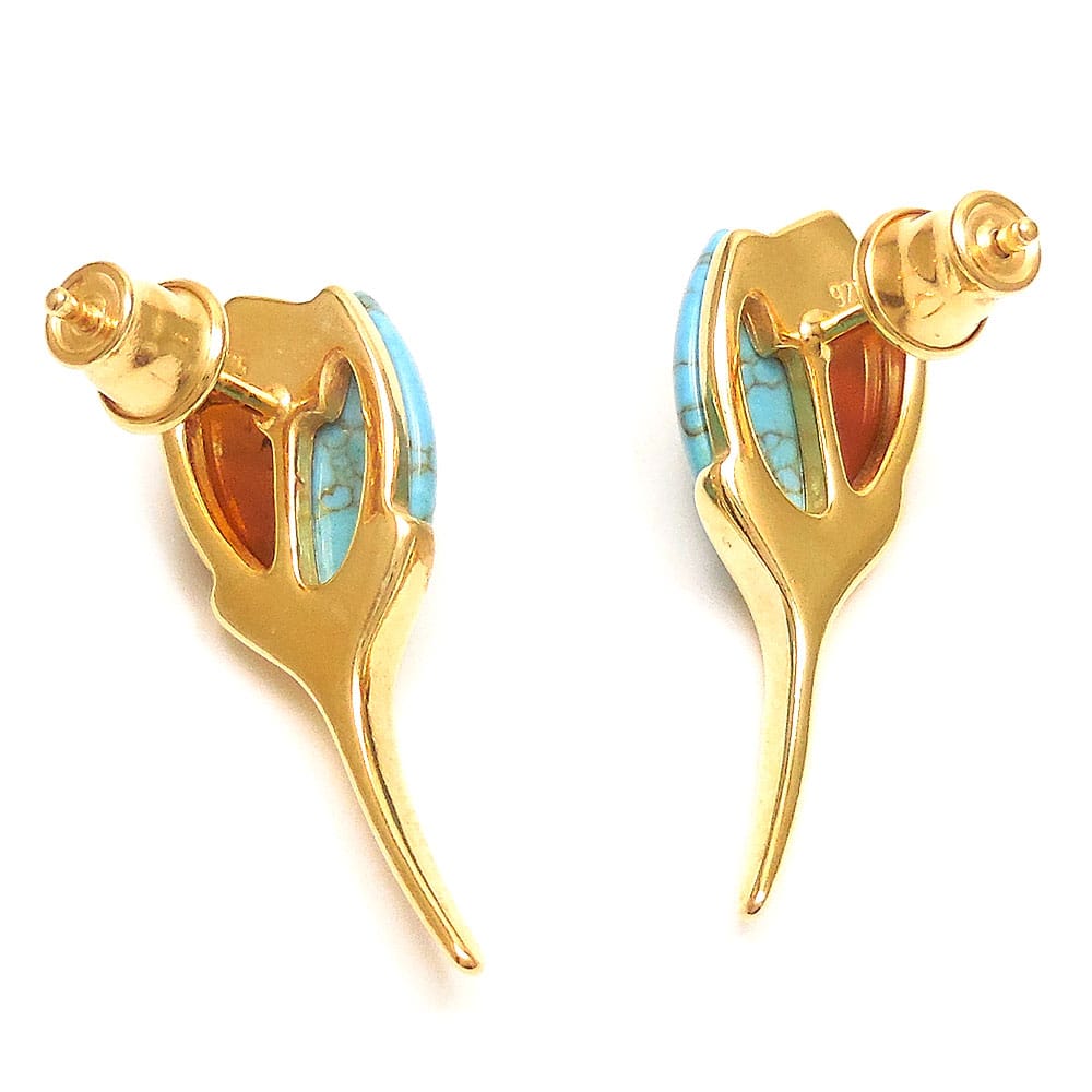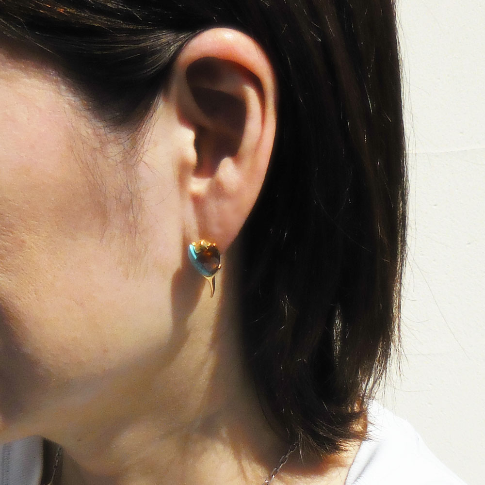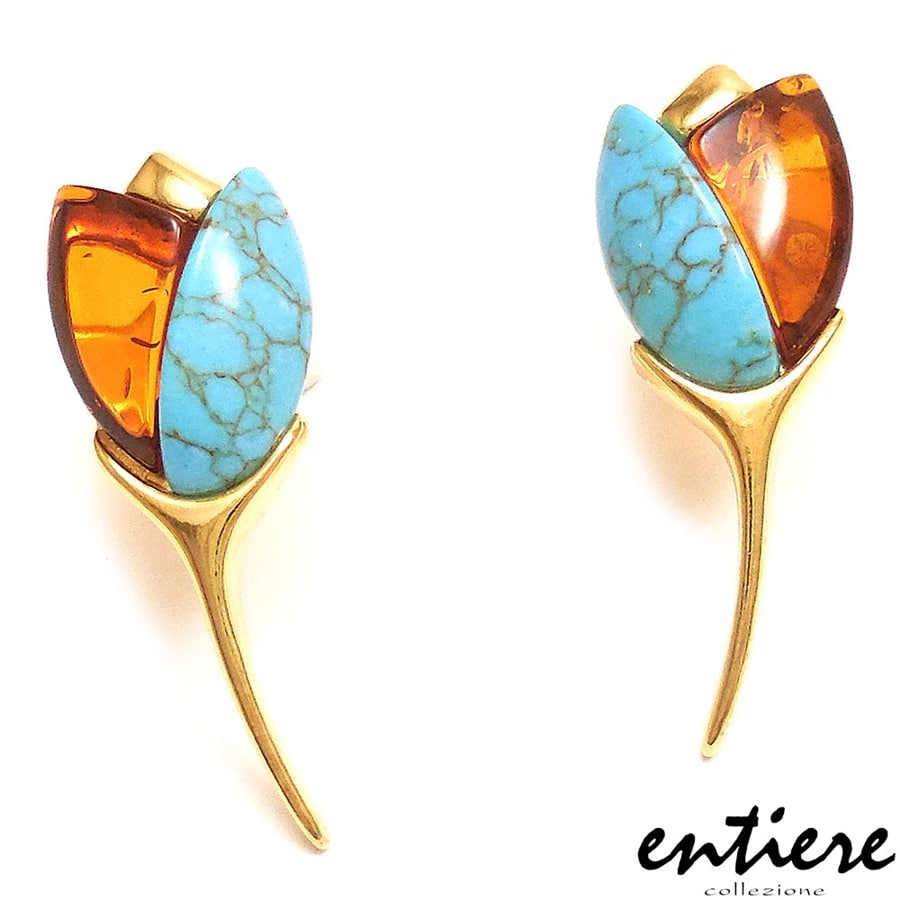 ゴールドカラーにアンバーのブラウンとターコイズのブルーが織りなす、可愛らしくもあり、しっとりと落ち着いたデザイン。カラフルな色合いがにぎやかに耳元をアピール。