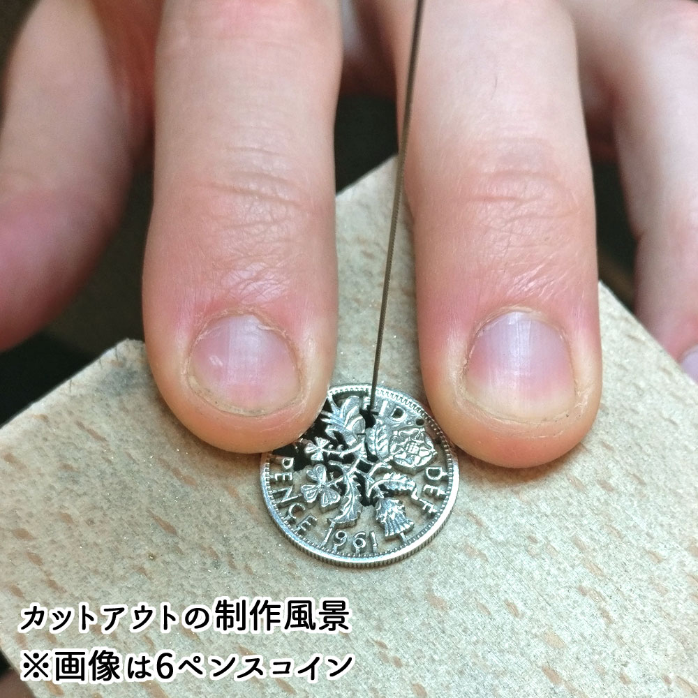 コインの図柄だけでなく、周りの文字・製造年も残す細かい切り抜きが見事。複雑で繊細な透かしデザインが楽しめます。