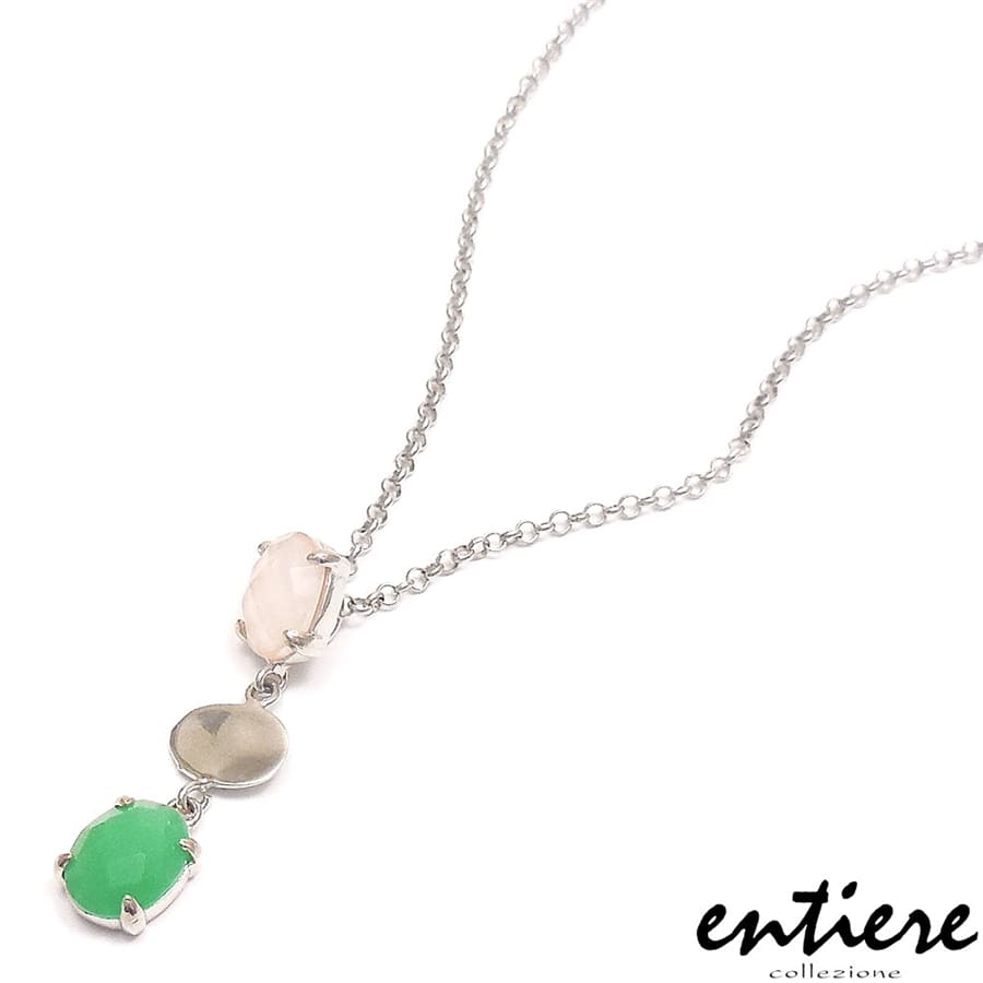 ファセットカットのローズクォーツとクリソプレーズが揺れるペンダント・ネックレスです。