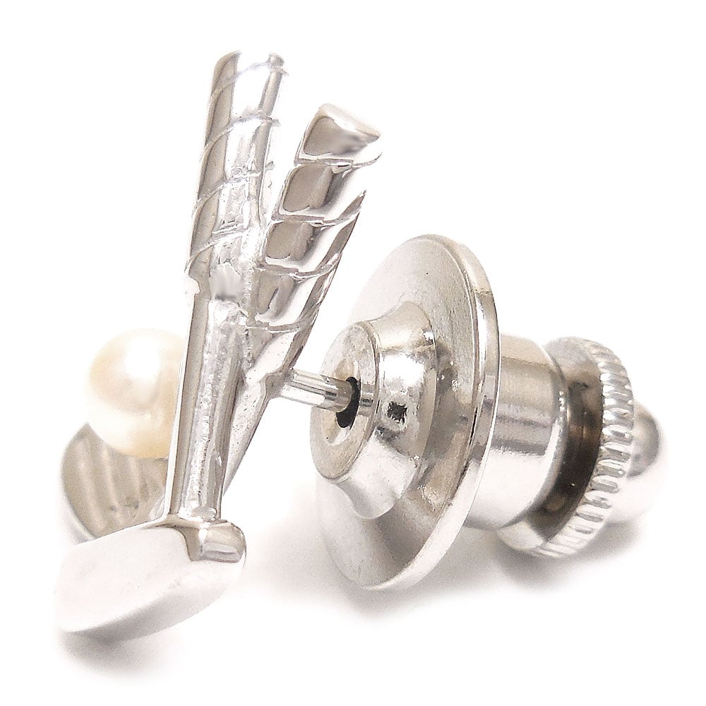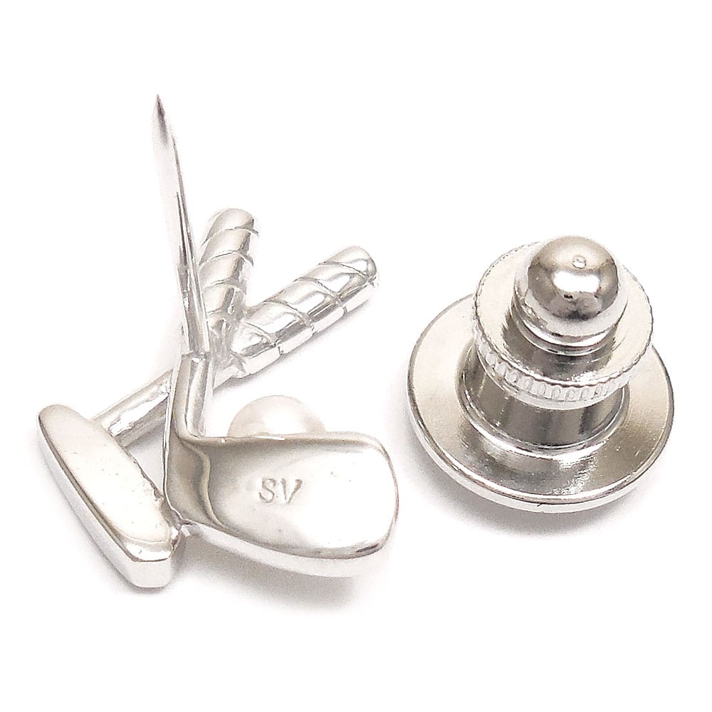 短くデフォルメしたアイアンとパター、2本のゴルフクラブがクロスするシルバーピンブローチです。