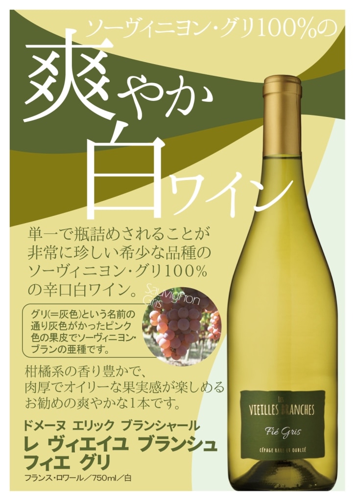 稀少な品種で単一で瓶詰めされることが非常に珍しい、ソーヴィニヨン・グリ(=フィエ・グリ)100%の辛口白ワイン。グリ(=灰色)という名前の通り、灰色がかったピンク色の果皮でソーヴィニヨン・ブランの亜種になります。